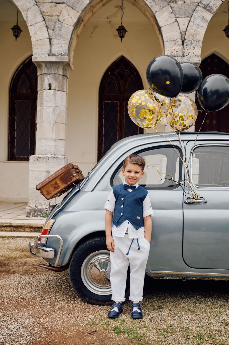 Ένα εντυπωσιακό βαπτιστικό σύνολο για αγόρι που ξεχωρίζει για τη διαχρονική του αισθητική και την καθαρή, καλοκαιρινή χρωματική παλέτα. Το σύνολο αποτελείται από υπόλευκο λινό πουκάμισο που προσφέρει άνεση και δροσερή αίσθηση, συνδυασμένο με κομψό γιλέκο σε σκούρα μπλε απόχρωση με διακριτικά κουμπιά. Το μπλε παπιγιόν ολοκληρώνει αρμονικά το επάνω μέρος, προσθέτοντας μια πινελιά κλασικής κομψότητας. Το λευκό παντελόνι σε άνετη γραμμή συμπληρώνει ιδανικά το σύνολο, ενώ η μπλε πλεκτή ζώνη-κορδόνι στη μέση δημιουργεί μια μοντέρνα και ιδιαίτερη λεπτομέρεια που δένει όμορφα με το γιλέκο και το παπιγιόν. Οι αποχρώσεις και ο σχεδιασμός του συνόλου αποπνέουν έναν διακριτικό ναυτικό αέρα, ιδανικό για μια καλοκαιρινή βάπτιση. Ένα καλαίσθητο και προσεγμένο σύνολο, ιδανικό για τη σημαντική ημέρα της βάπτισης, που χαρίζει στο μικρό σας μια κομψή και ξεχωριστή εμφάνιση.