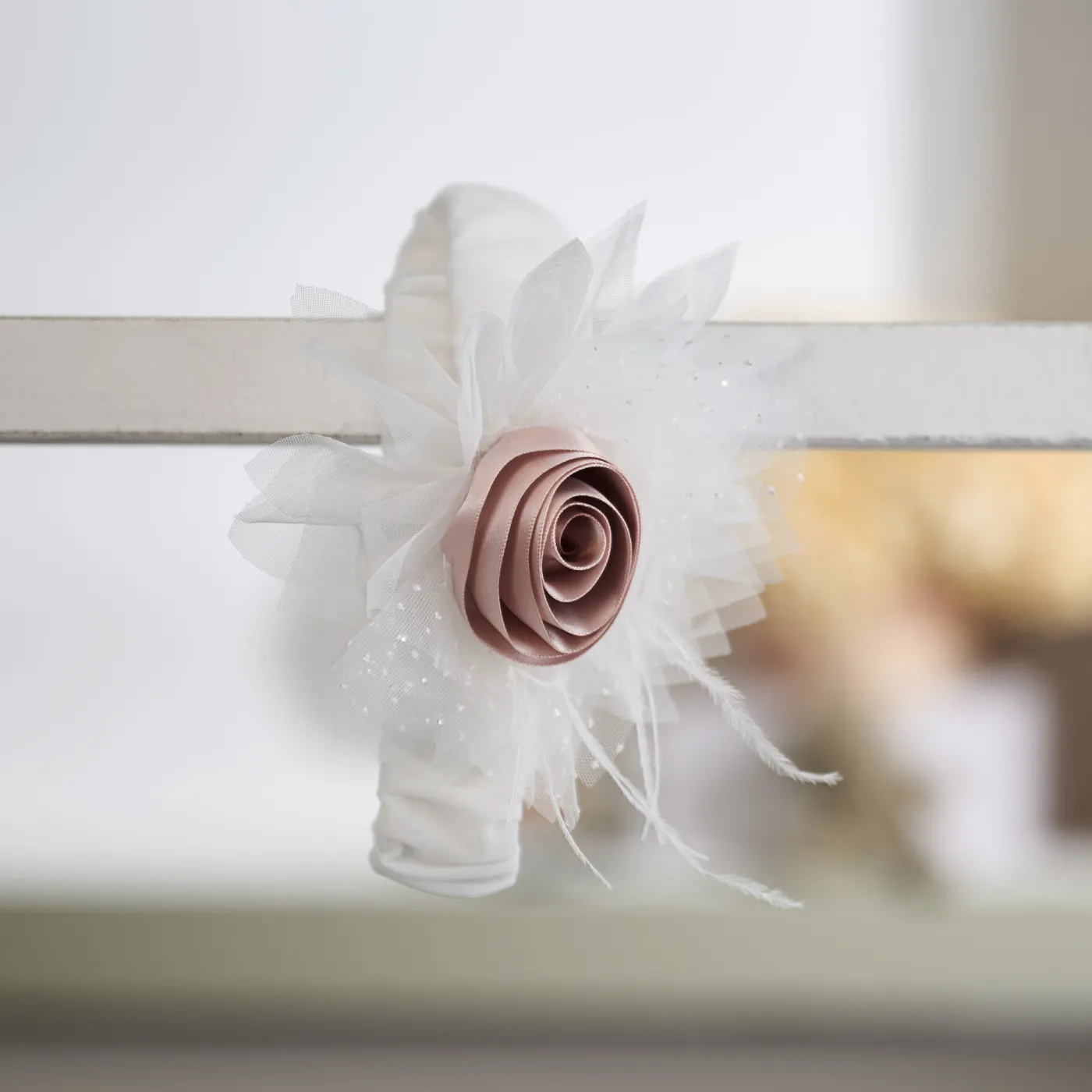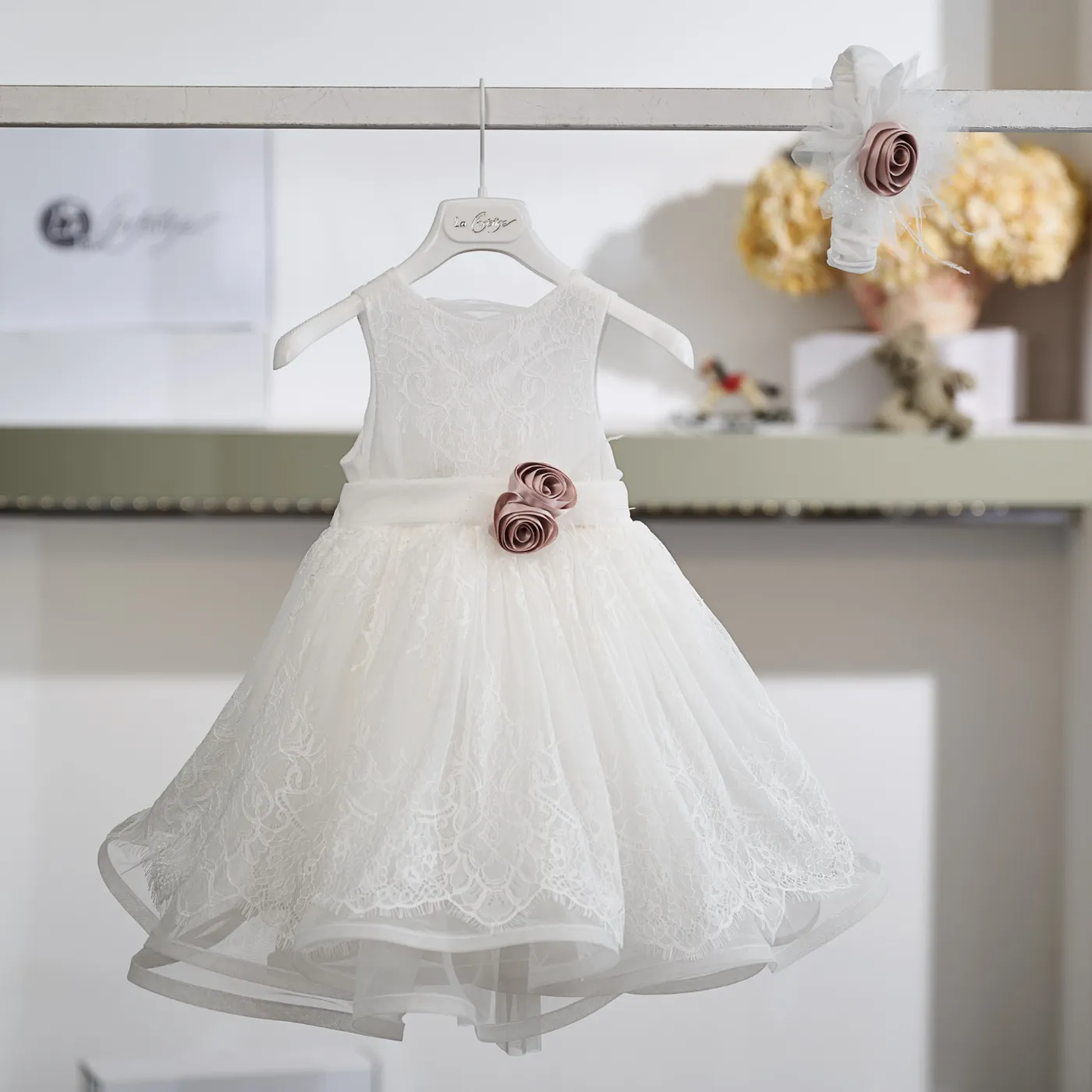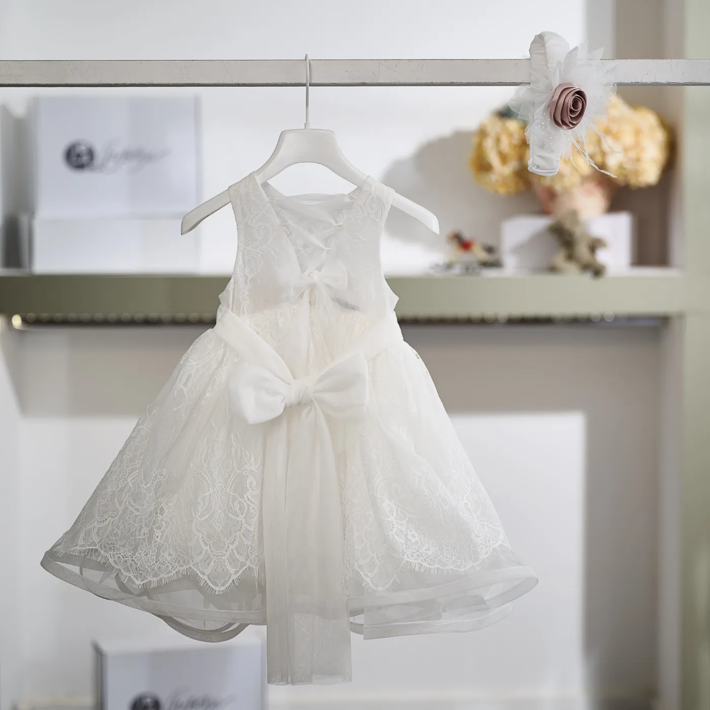 Το σύνολο ολοκληρώνεται με ασορτί κορδέλα μαλλιών διακοσμημένη με τούλι και χειροποίητο σατέν λουλούδι στην ίδια απόχρωση.