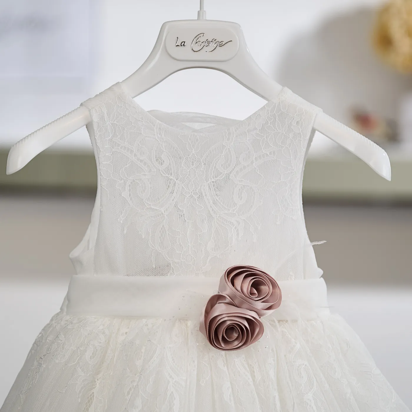 Η εκλεπτυσμένη αισθητική και οι ρομαντικές λεπτομέρειες αναδεικνύουν αυτό το ιδιαίτερα καλαίσθητο βαπτιστικό φόρεμα σε off white απόχρωση.