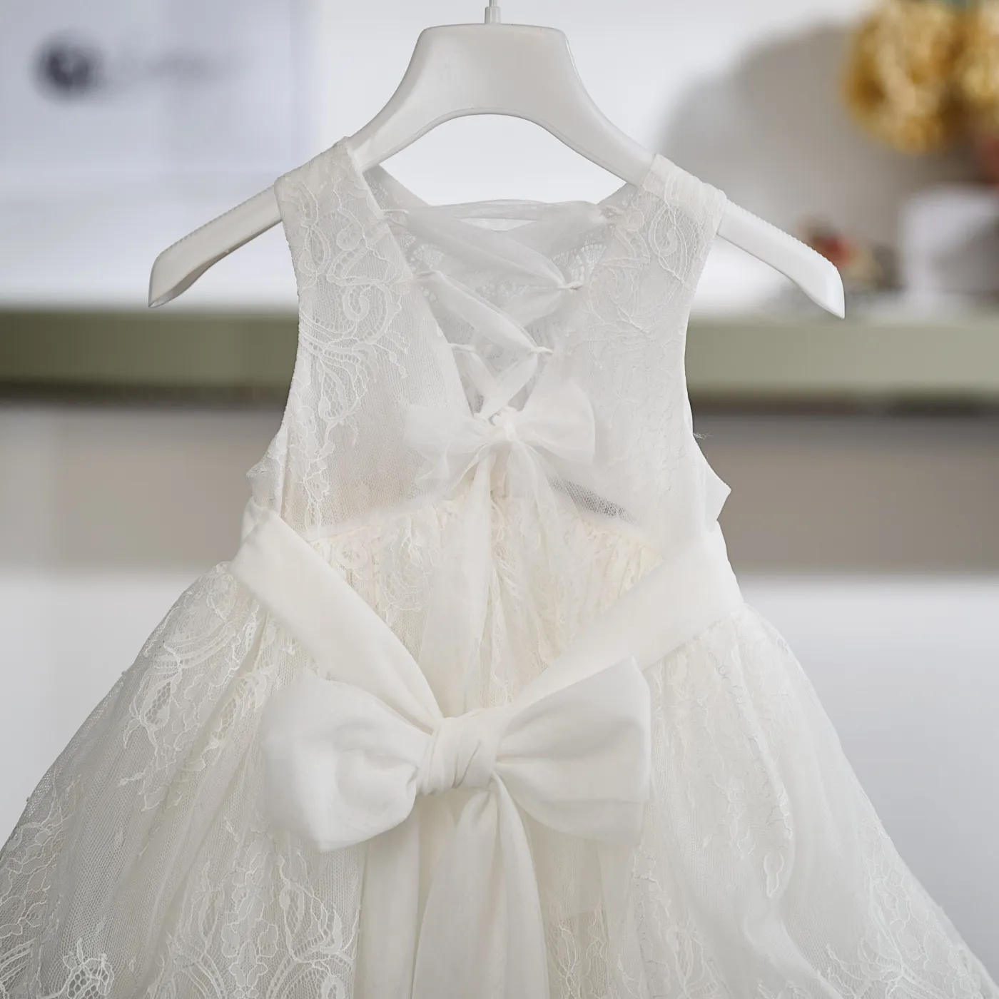 Η εκλεπτυσμένη αισθητική και οι ρομαντικές λεπτομέρειες αναδεικνύουν αυτό το ιδιαίτερα καλαίσθητο βαπτιστικό φόρεμα σε off white απόχρωση. Το κορσάζ είναι διακοσμημένο με φίνα δαντέλα που χαρίζει μια αίσθηση διακριτικής πολυτέλειας, ενώ στο πίσω μέρος διαθέτει εντυπωσιακό άνοιγμα με χιαστί κορδόνια από τούλι που δένουν απαλά, δημιουργώντας μια ιδιαίτερα κομψή λεπτομέρεια.