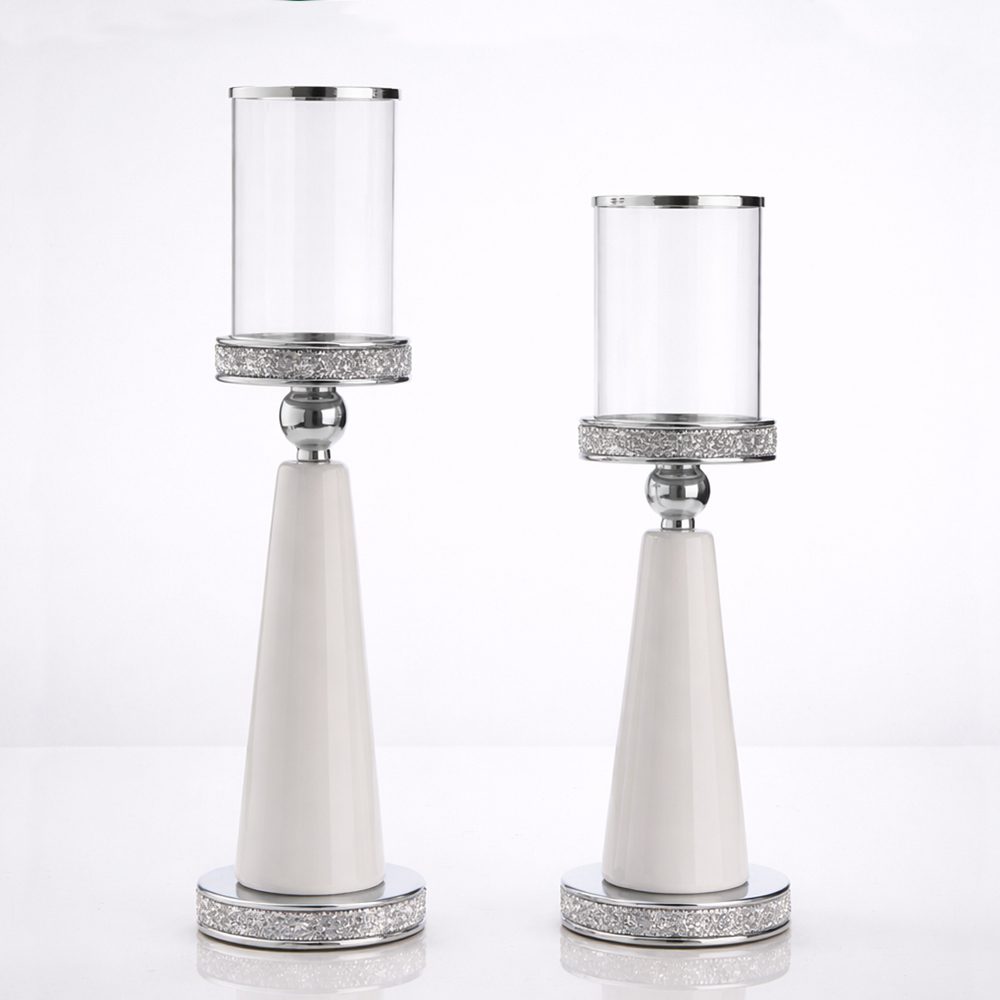 Σετ λαμπάδων γάμου με λευκά κηροπήγια, ασημένια λεπτομέρεια και γυάλινο επάνω μέρος. Είναι πραγματικά μια εξαιρετική επιλογή για την ημέρα του γάμου σας.