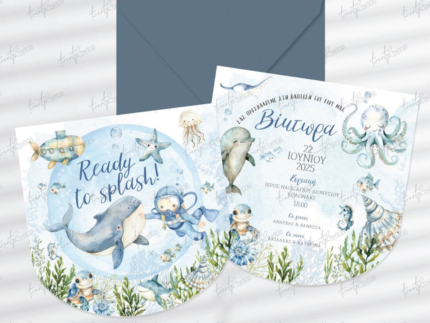 Προσκλητήριο βάπτισης για αγόρι 'Ready to splash!' από την 22twins. Ένας μαγικός βυθός με φάλαινα, δελφίνι και δύτη σε watercolor τόνους.