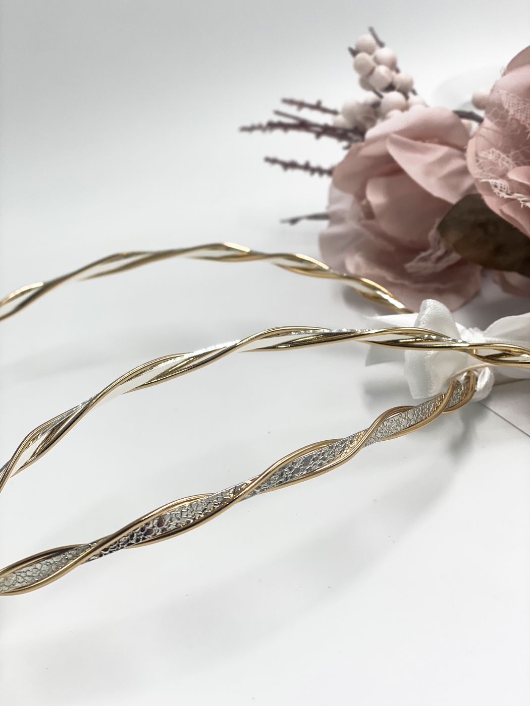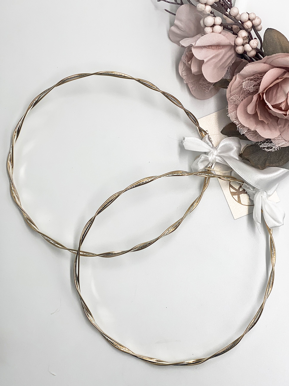 Στέφανα γάμου επάργυρα, κατασκευασμένα από δύο πλεγμένα, σπειροειδή κομμάτια — ένα σε χρυσό και ένα σε ασημί χρώμα με ανάγλυφη υφή — που ενώνονται στο πίσω μέρος με κορδέλα.