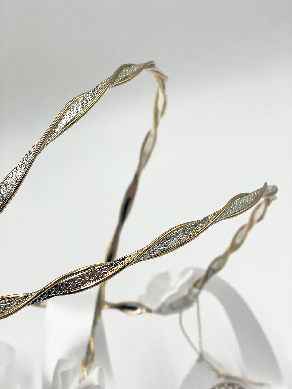 Στέφανα γάμου επάργυρα, κατασκευασμένα από δύο πλεγμένα, σπειροειδή κομμάτια — ένα σε χρυσό και ένα σε ασημί χρώμα σφυρίλατο — που ενώνονται στο πίσω μέρος με κορδέλα.