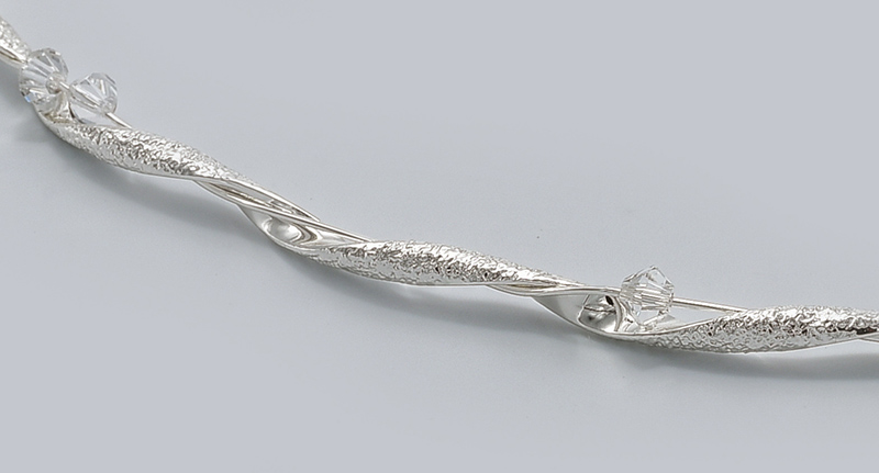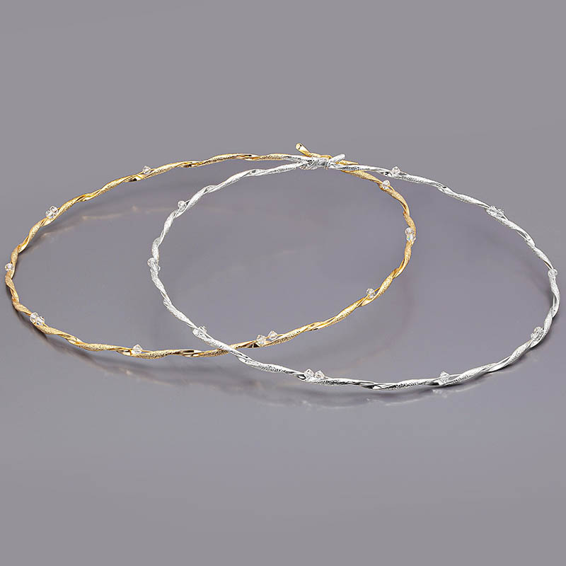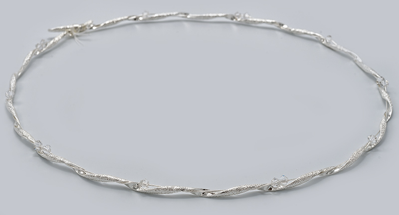 Χειροποίητα στέφανα που ξεχωρίζουν για τον ιδιαίτερο σχεδιασμό τους που συνδυάζει την παράδοση με τη σύγχρονη κομψότητα. Πρόκειται για λεπτές βέργες που μπλέκονται μεταξύ τους (twisted design), δημιουργώντας μια αίσθηση κίνησης και οργανικής φόρμας. Είναι διακοσμημένα με διακριτικά κρυσταλλάκια που αντανακλούν το φως, προσθέτοντας μια απαλή λάμψη.