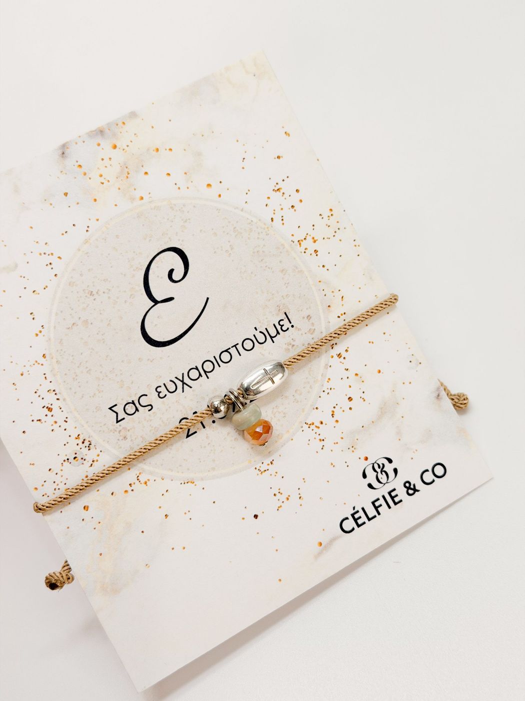 Μαρτυρικό βραχιόλι με μπεζ κορδόνι, δίχρωμη βεραμάν χάντρα, ασημί χάντρα, κρύσταλλο και σταυρό σε ασημί απόχρωση.