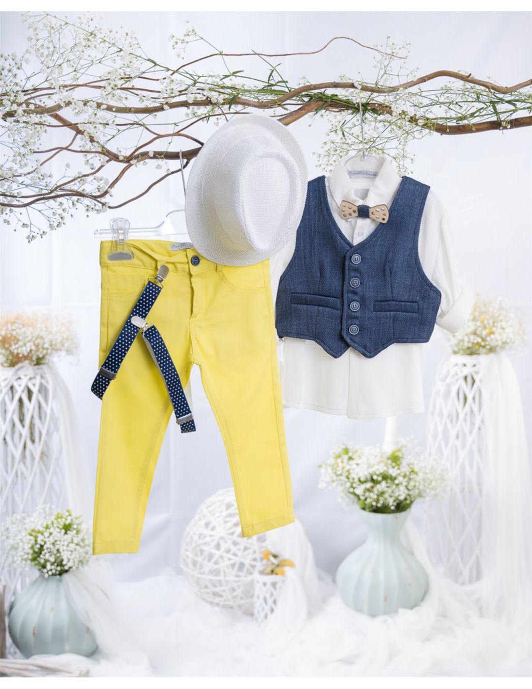 Ολοκληρωμένο βαπτιστικό κοστούμι με κίτρινο παντελόνι, λευκό πουκάμισο, μπλε γιλέκο με κουμπιά, πουά τιράντες, ξύλινο παπιγιόν με σχέδιο ψαροκόκαλο και λευκό καπέλο