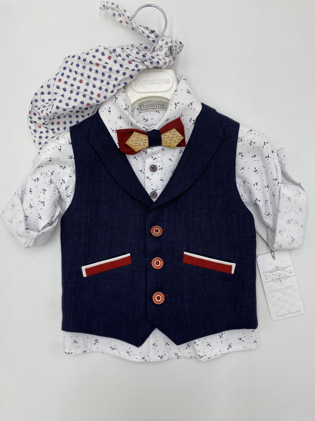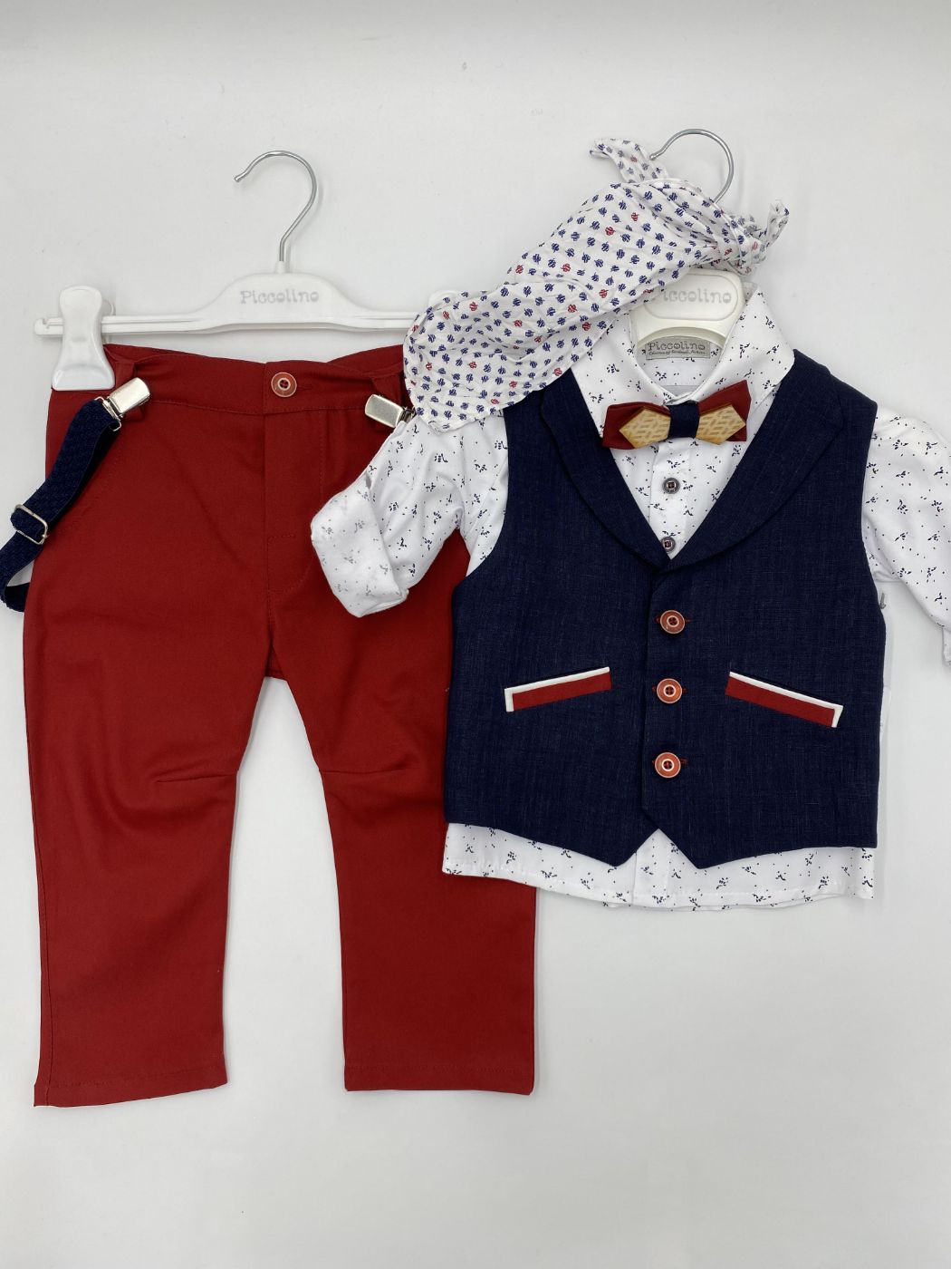 Βαπτιστικό σετ για αγόρι το οποίο περιλαμβάνει ένα βαμβακερό κόκκινο παντελόνι, σκούρο μπλε γιλέκο με διακοσμητικές κόκκινες λεπτομέρειες στις τσέπες, πουκάμισο με διακριτικό μοτίβο και ξύλινα κουμπιά, τιράντες, παπιγιόν ξύλινο και καπελάκι.