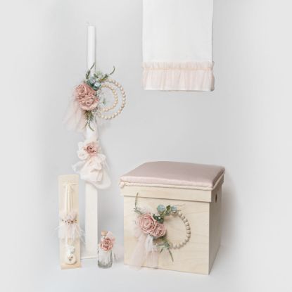 Ένα ιδιαίτερο στεφάνι από ξύλινες χάντρες , στολισμένο με ροζ λουλούδια , αποτελεί το θέμα αυτού του ρομαντικού σετ βάπτισης.Το χρώμα των λουλουδιών σε σάπιο μήλο συνδυασμένο με το ροζ απαλό τούλι κάνει τη σύνθεση μοναδική. Το ξύλινο κουτί αποθήκευσης έχει διπλή χρησιμότητα αφού είναι και παγκάκι . Στο ίδιο στυλ τα λαδόπανα και το λαδοσέτ ολοκληρώνουν μια εντυπωσιακή σύνολο.