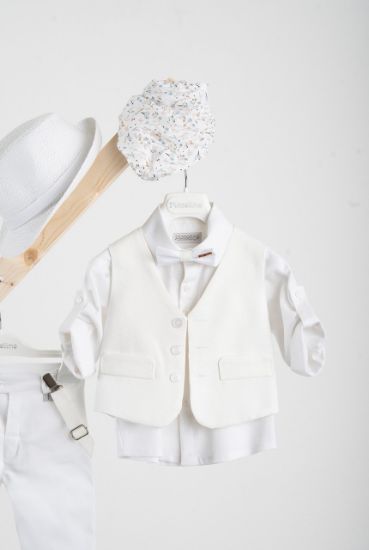 Βαπτιστικό κοστούμι Piccolino Pablo σε χρώμα White. Περιλαμβάνει γιλέκο λευκο με λεπτομέρειες πουά, πουκάμισο λινό, παντελόνι βαμβακερό σε χρώμα white, παπιγιόν με ξύλινη λεπτομέρεια, τιράντες και καπέλο με φάσα. Διαθέσιμο σε 4 μεγέθη 6-12, 12-18, 18-24, 24-36 (εξτρά χρέωση)