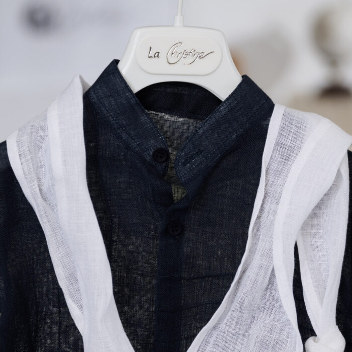 Το πουκάμισο συνοδεύεται από λευκό υφασμάτινο φουλάρι που προσθέτει μια αέρινη και κομψή πινελιά, δημιουργώντας μια όμορφη αντίθεση με το σκούρο μπλε. Το σετ ολοκληρώνεται με λευκό λινό παντελόνι με διακοσμητικά κουμπιά στο μπροστινό μέρος και αποσπώμενες τιράντες σε μπλε απόχρωση, που χαρίζουν έναν διαχρονικό αλλά και ιδιαίτερο χαρακτήρα στο σύνολο. Ένα βαπτιστικό σύνολο που συνδυάζει αρμονικά το μπλε με το λευκό, δημιουργώντας μια κομψή και καλοκαιρινή εμφάνιση, ιδανική για μια ξεχωριστή και αξέχαστη ημέρα βάπτισης.