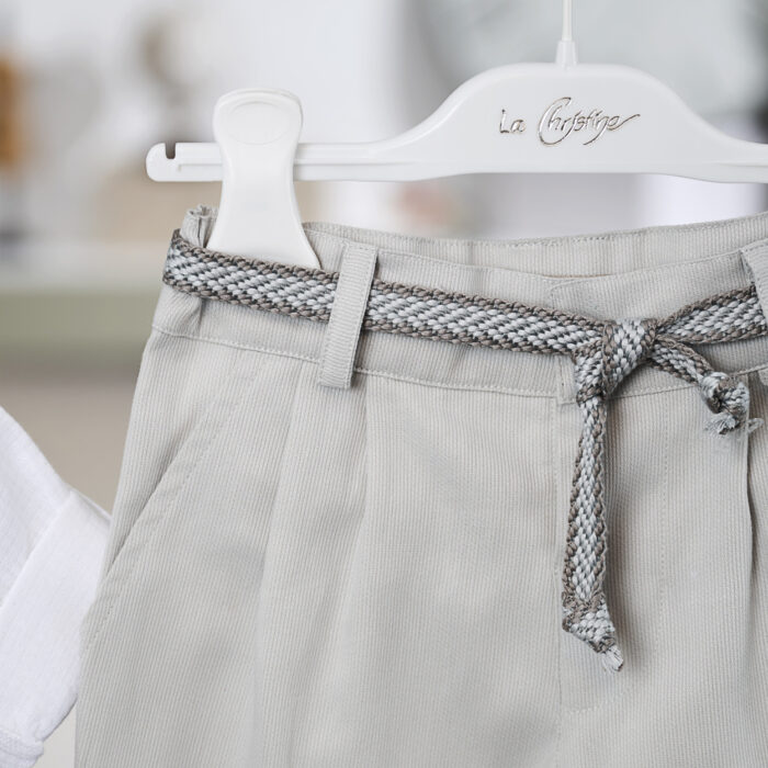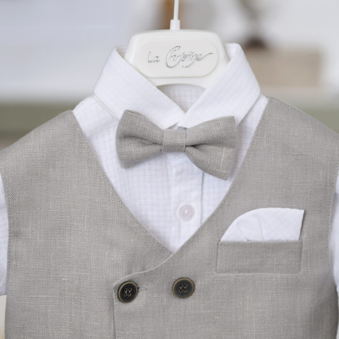 Ένα κομψό και διαχρονικό βαπτιστικό σετ για αγόρι, σε γκρι αποχρώσεις, έξι τεμαχίων, ιδανικό για μια ιδιαίτερη και προσεγμένη εμφάνιση την ημέρα της βάπτισης. Το σύνολο περιλαμβάνει λευκό πουκάμισο με διακριτική καρό ύφανση, που χαρίζει κομψότητα και ξεχωριστή υφή στο ντύσιμο. Συνδυάζεται με γιλέκο με διπλή σειρά κουμπιών και περίτεχνη υφαντή υφή, το οποίο προσθέτει φινέτσα και διαχρονικό χαρακτήρα στο σύνολο. Το διακοσμητικό μαντηλάκι στο τσεπάκι και το παπιγιόν σε ταιριαστή απόχρωση ολοκληρώνουν αρμονικά την επίσημη εμφάνιση. Το παντελόνι σε άνετη γραμμή συνοδεύεται από ζώνη τύπου μακραμέ με διακριτικό μοτίβο, προσθέτοντας ιδιαίτερο στυλ και μια ξεχωριστή πινελιά στο σύνολο. Τα προσεγμένα υφάσματα και οι κομψές λεπτομέρειες δημιουργούν ένα ισορροπημένο αποτέλεσμα που συνδυάζει άνεση και διακριτική πολυτέλεια.