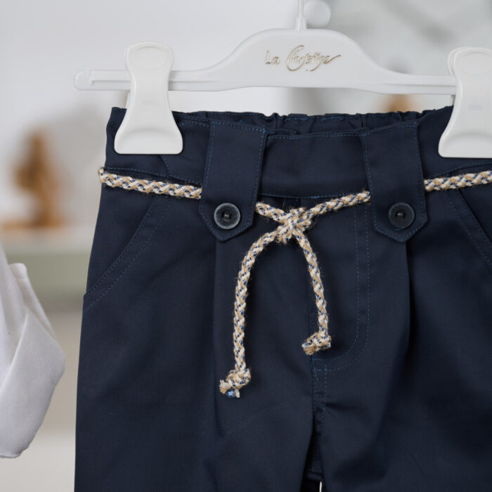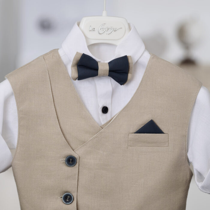 Ένα εκλεπτυσμένο βαπτιστικό σύνολο για αγόρι που συνδυάζει την κλασική αισθητική με μοντέρνες λεπτομέρειες. Το σετ αποτελείται από υπόλευκο λινό πουκάμισο, το οποίο προσφέρει δροσερή και άνετη εφαρμογή, ιδανική για τις ζεστές καλοκαιρινές ημέρες. Συνδυάζεται αρμονικά με μπεζ γιλέκο σε κομψή γραμμή προσθέτοντας μια ιδιαίτερη και εκλεπτυσμένη πινελιά στο σύνολο. Το γιλέκο διαθέτει διακοσμητικά κουμπιά και τσεπάκι με μαντηλάκι σε σκούρα μπλε απόχρωση που δημιουργεί μια όμορφη χρωματική αντίθεση. Το σύνολο συμπληρώνεται με κομψό παπιγιόν σε μπεζ και μπλε τόνους που προσθέτει μια διακριτική πινελιά φινέτσας. Το παντελόνι σε σκούρο ραφ χρώμα διαθέτει άνετη γραμμή και ξεχωρίζει με το διακοσμητικό πλεκτό κορδόνι στη μέση σε μπεζ και μπλε αποχρώσεις. Ένα ιδιαίτερο βαπτιστικό σύνολο που αποπνέει κομψότητα, καλοκαιρινή φρεσκάδα και διαχρονικό στυλ, ιδανικό για να χαρίσει στο μικρό σας μια ξεχωριστή εμφάνιση