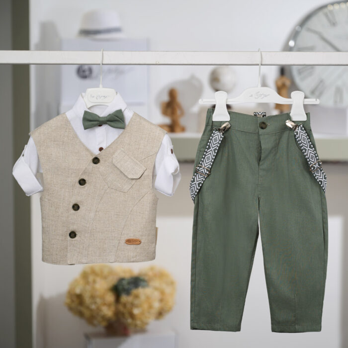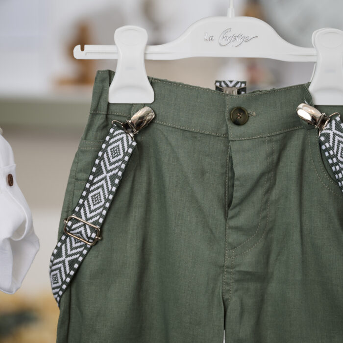 Το ντύσιμο ολοκληρώνεται με χακί παντελόνι τύπου barrel που χαρίζει μοντέρνα γραμμή και άνετη εφαρμογή, ενώ οι τιράντες με γεωμετρικό μοτίβο και το παπιγιόν σε πράσινη απόχρωση δένουν αρμονικά το σύνολο, δημιουργώντας μια ισορροπημένη και καλαίσθητη εμφάνιση. Μια ξεχωριστή επιλογή βαπτιστικού συνόλου που συνδυάζει φυσικά υφάσματα, σύγχρονο σχεδιασμό και διαχρονική κομψότητα, ώστε ο μικρός πρωταγωνιστής να ξεχωρίσει την πιο σημαντική του ημέρα.