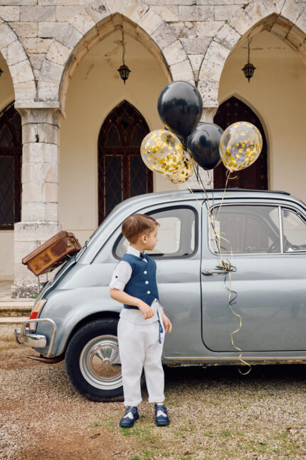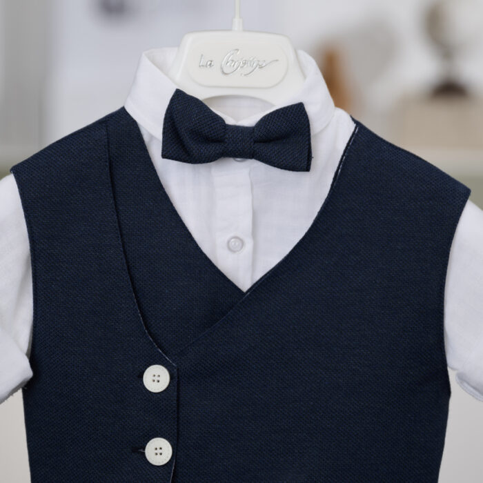 Ένα εντυπωσιακό βαπτιστικό σύνολο για αγόρι που ξεχωρίζει για τη διαχρονική του αισθητική και την καθαρή, καλοκαιρινή χρωματική παλέτα. Το σύνολο αποτελείται από υπόλευκο λινό πουκάμισο που προσφέρει άνεση και δροσερή αίσθηση, συνδυασμένο με κομψό γιλέκο σε σκούρα μπλε απόχρωση με διακριτικά κουμπιά. Το μπλε παπιγιόν ολοκληρώνει αρμονικά το επάνω μέρος, προσθέτοντας μια πινελιά κλασικής κομψότητας. Το λευκό παντελόνι σε άνετη γραμμή συμπληρώνει ιδανικά το σύνολο, ενώ η μπλε πλεκτή ζώνη-κορδόνι στη μέση δημιουργεί μια μοντέρνα και ιδιαίτερη λεπτομέρεια που δένει όμορφα με το γιλέκο και το παπιγιόν. Οι αποχρώσεις και ο σχεδιασμός του συνόλου αποπνέουν έναν διακριτικό ναυτικό αέρα, ιδανικό για μια καλοκαιρινή βάπτιση. Ένα καλαίσθητο και προσεγμένο σύνολο, ιδανικό για τη σημαντική ημέρα της βάπτισης, που χαρίζει στο μικρό σας μια κομψή και ξεχωριστή εμφάνιση.