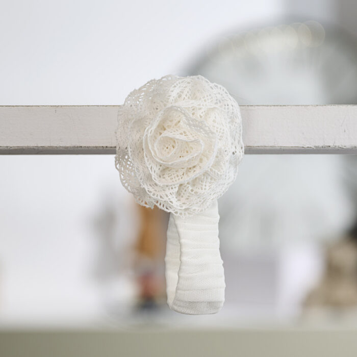 Το φόρεμα συνοδεύεται από ασορτί κορδέλα μαλλιών σε ιβουάρ τόνο, διακοσμημένη με δαντελένιο λουλούδι, συμπληρώνοντας με κομψότητα την εμφάνιση.