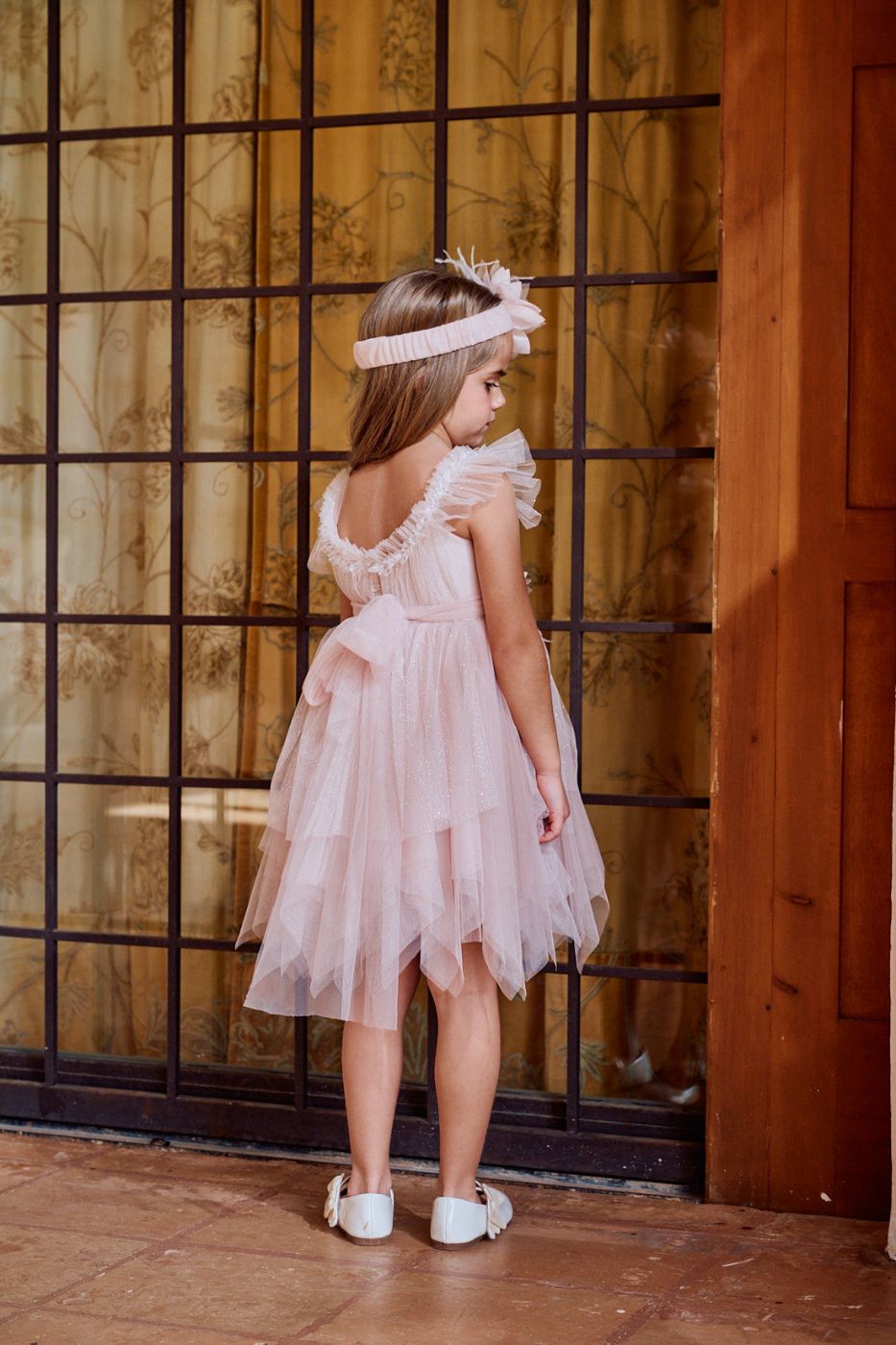Ψηλόμεσο φόρεμα σε γλυκιά ροδί απόχρωση, η φούστα, από πολλαπλές στρώσεις glitter τούλι, δημιουργεί υπέροχες γεωμετρίες.