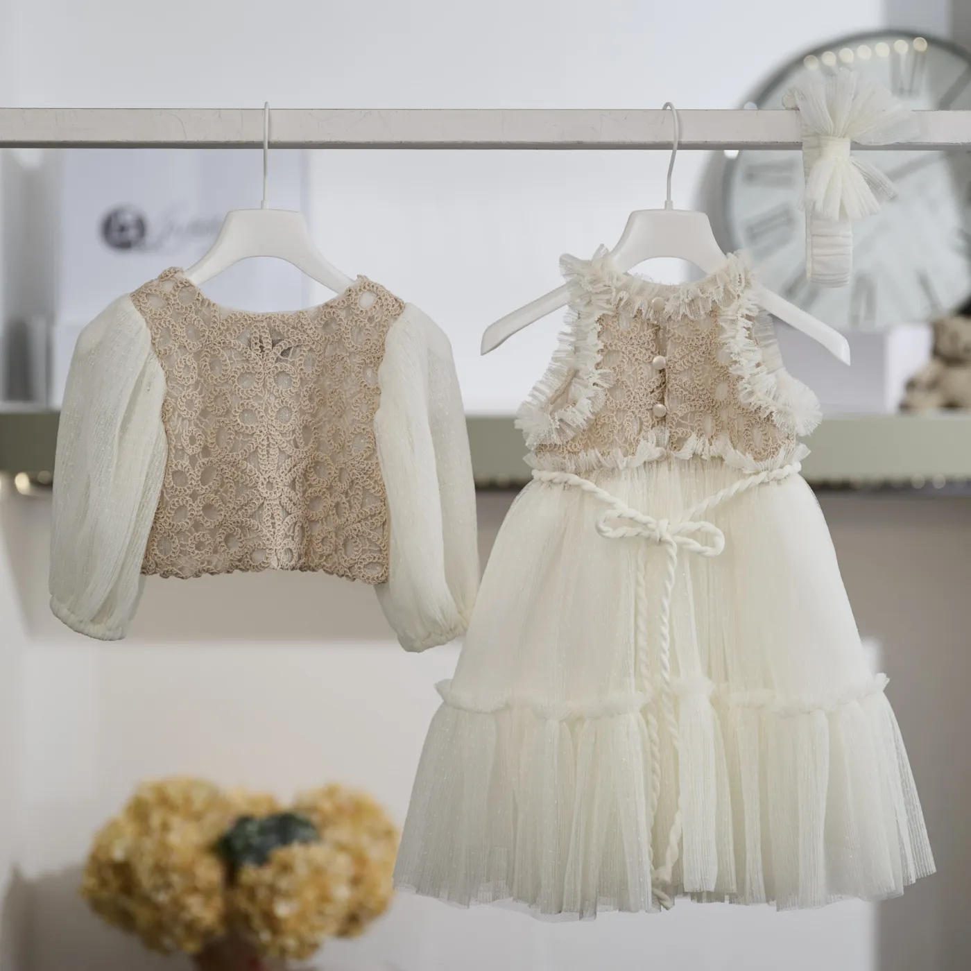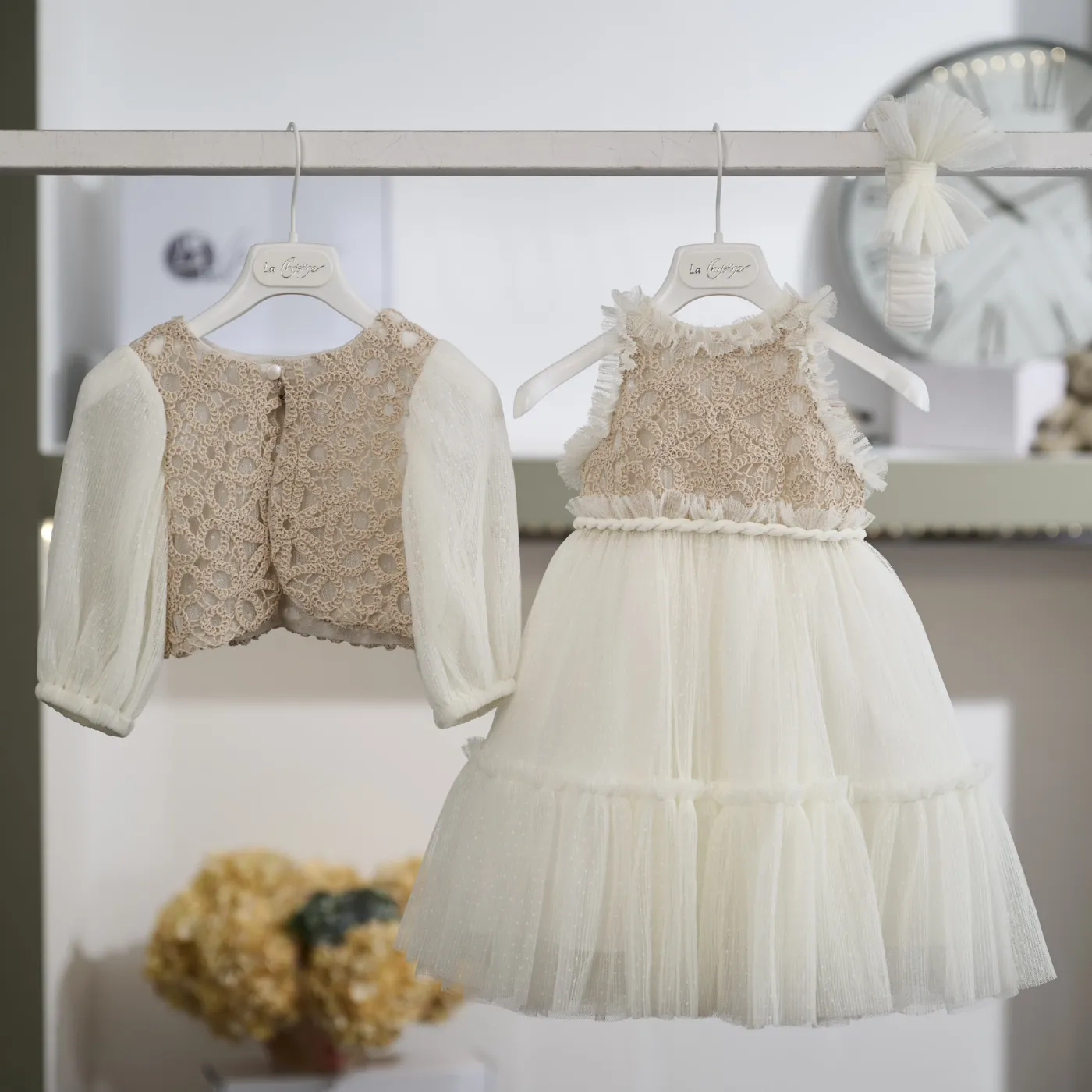 Το σύνολο συμπληρώνεται από ασορτί κορδέλα μαλλιών σε ιβουάρ τόνο, διακοσμημένη με τούλινο φιόγκο, ολοκληρώνοντας κομψά την εμφάνιση.