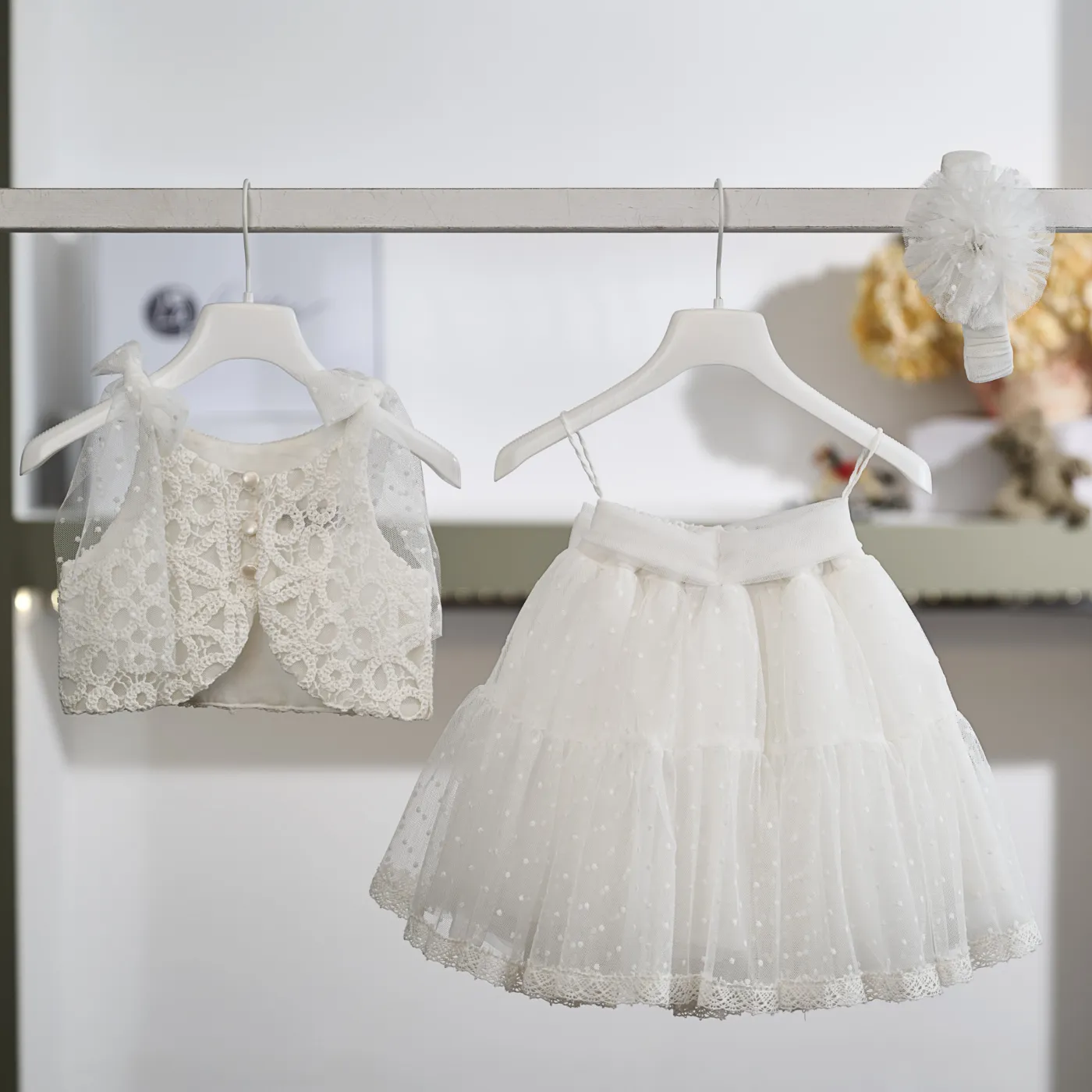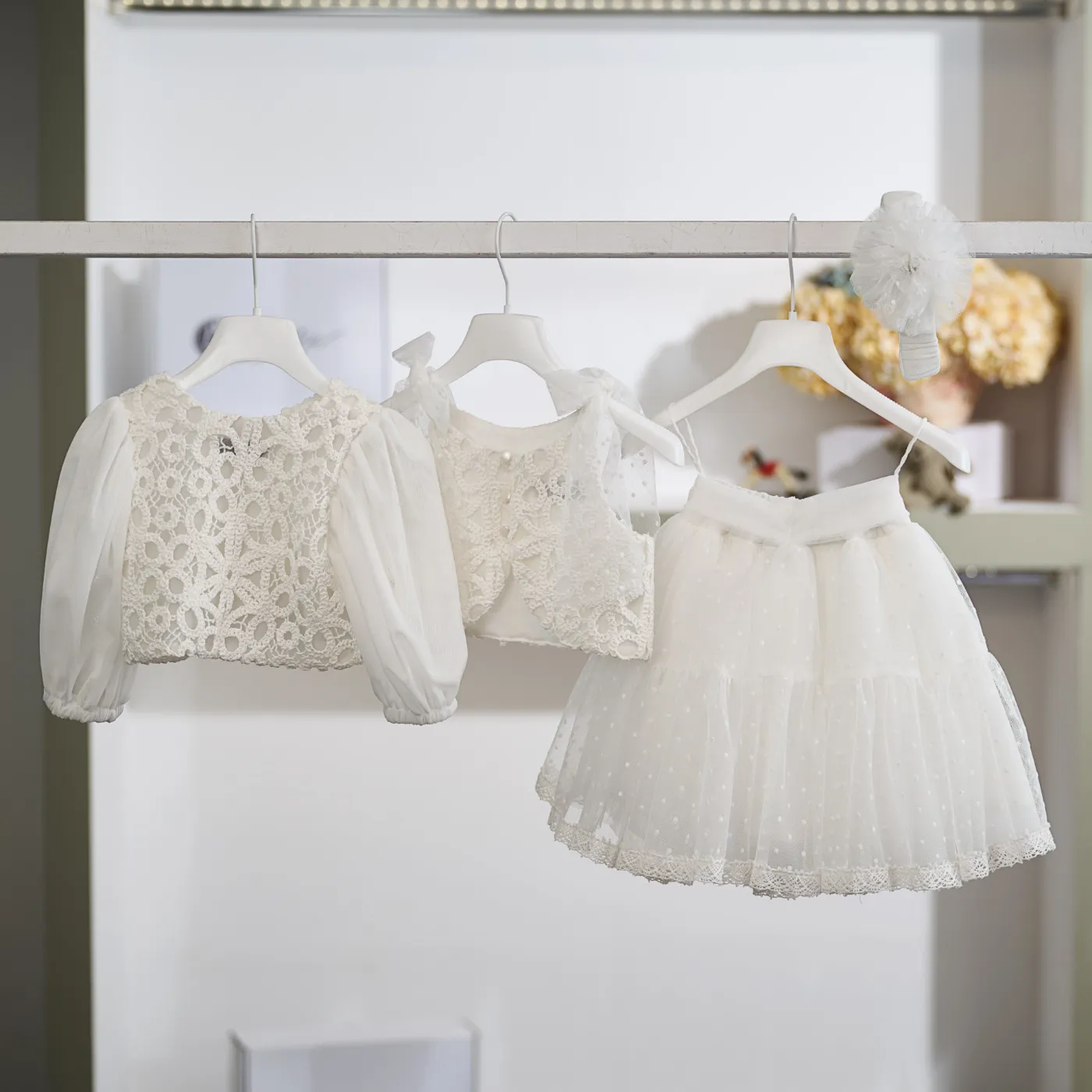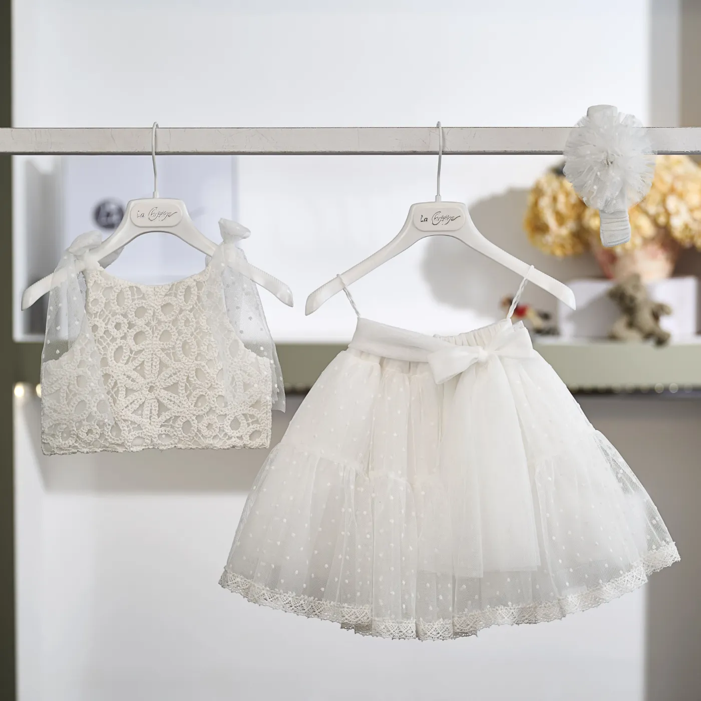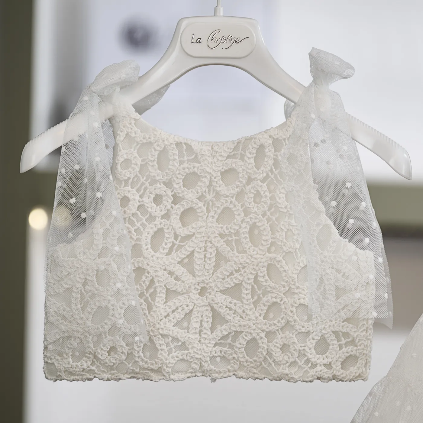 Το σύνολο αποτελείται από τοπ και φούστα, δημιουργώντας μια κομψή και ανάλαφρη εμφάνιση. Το τοπ είναι κατασκευασμένο από ύφασμα με περίτεχνη ύφανση τύπου μακραμέ, που χαρίζει ιδιαίτερη υφή και κομψότητα. Στο πίσω μέρος διακοσμείται με διακριτικά κουμπιά πέρλας, ενώ οι ώμοι στολίζονται με αέρινες τούλινες τιράντες που δένουν σε φιόγκο, προσθέτοντας μια ρομαντική πινελιά στο σχέδιο.