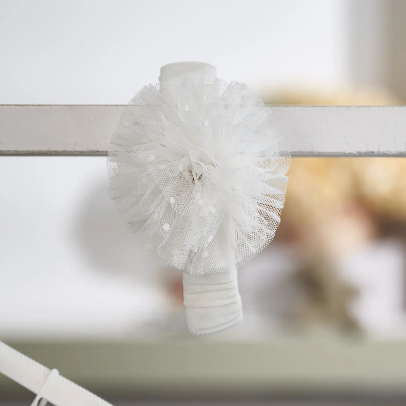 Το σύνολο ολοκληρώνεται με ασορτί κορδέλα μαλλιών διακοσμημένη με πλούσιο τούλινο λουλούδι, προσθέτοντας μια κομψή και αρμονική πινελιά στην εμφάνιση.