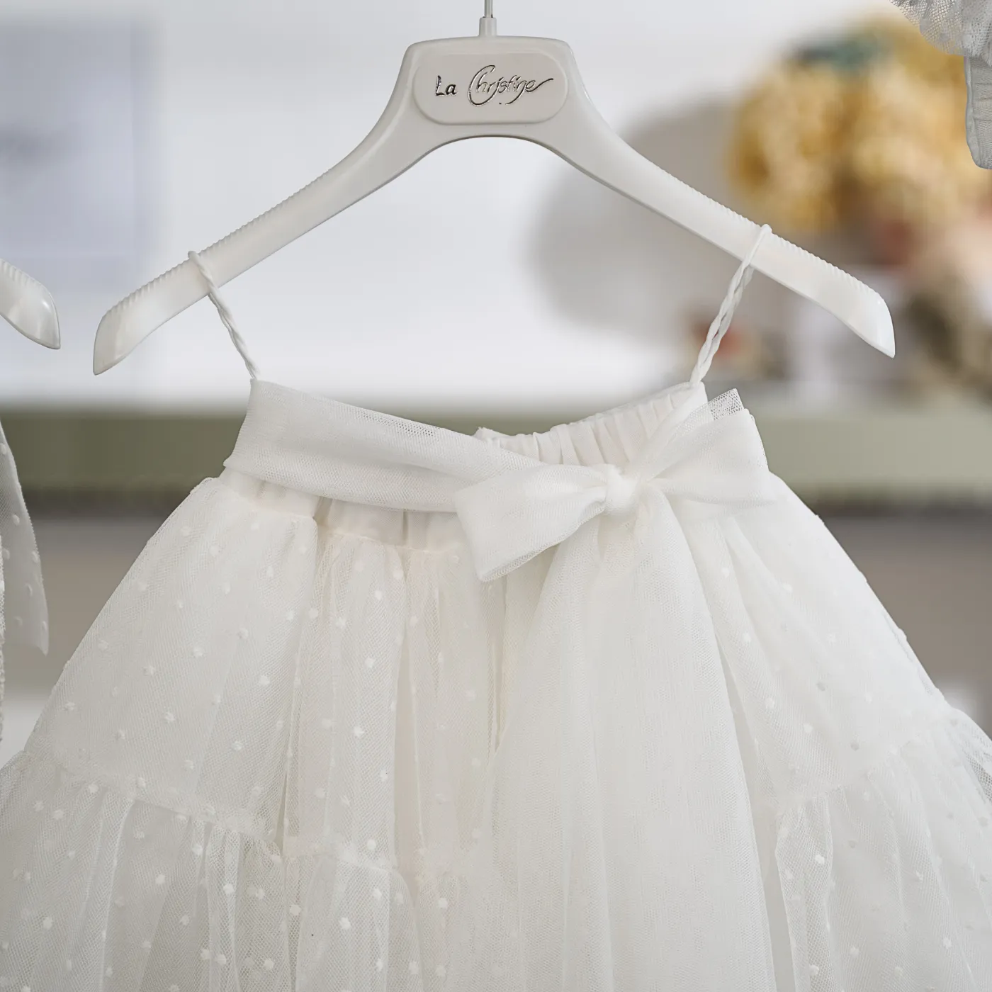 Η φούστα αποτελείται από πολλαπλές στρώσεις τούλι με κεντημένο πουά μοτίβο, προσφέροντας πλούσιο όγκο και αέρινη κίνηση. Στο τελείωμα διακοσμείται με λεπτεπίλεπτη δαντελένια τρέσα, ενώ η ζώνη της μέσης δένει στο πλάι σε κομψό τούλινο φιόγκο.