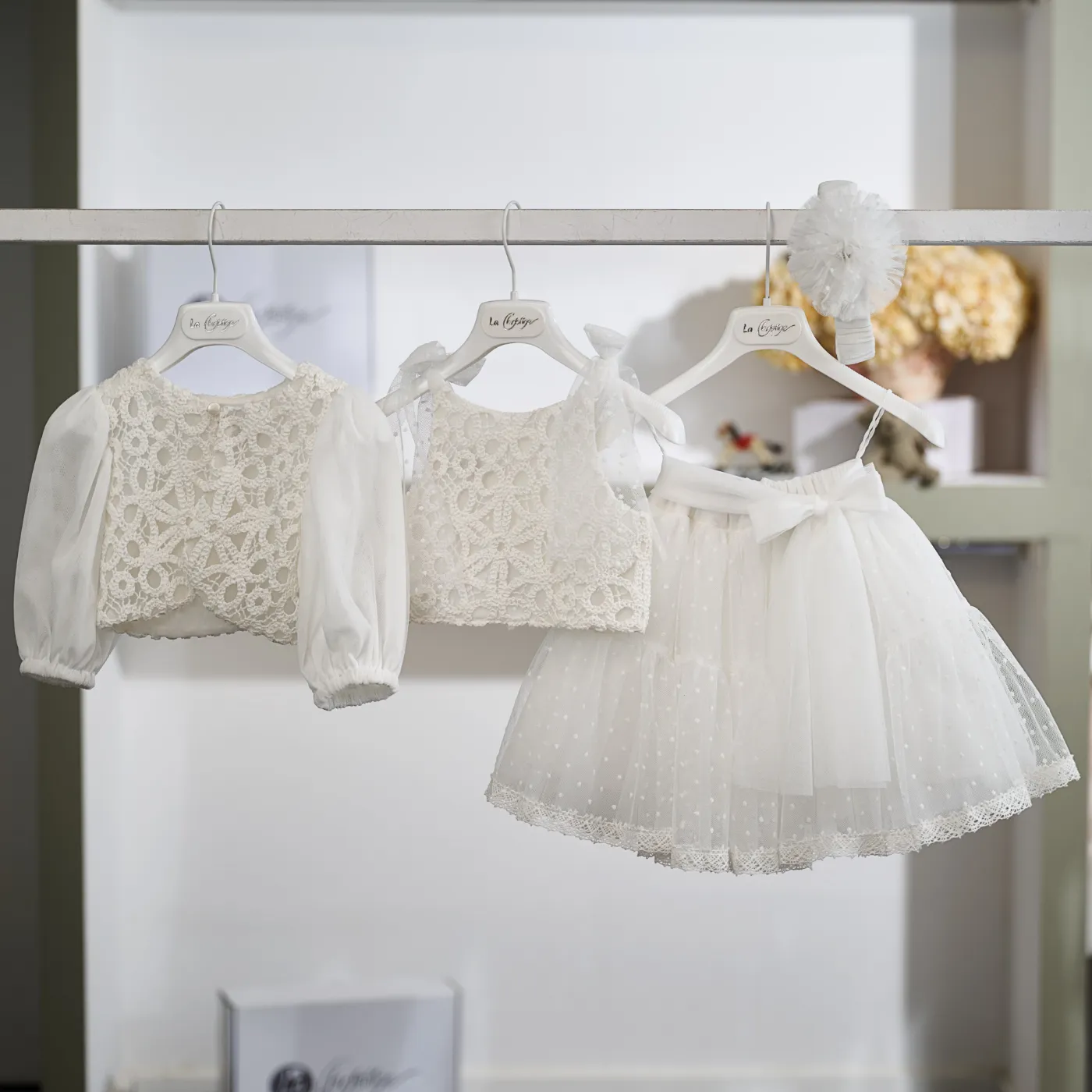 Η ρομαντική αισθητική και οι φίνα λεπτομέρειες αναδεικνύουν αυτό το ιδιαίτερα κομψό βαπτιστικό σύνολο σε off white απόχρωση.