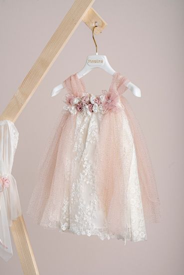 Βαπτιστικό φόρεμα Piccollino Tuliana Puce. Φόρεμα σε ριχτη γραμμή απο δαντέλα, με κομάτια απο σαπιο μήλο τούλι με χρυσό γκλίτερ τα οποία αποτελούν τις τιράντες και την προέκταση τους εμπρός και πίσω. Το ντεκόρ του φορέματος αποτελείται απο 22 χειροποίητα λουλούδια, δαντέλες και κορδέλες . Το φόρεμα συνοδέυεται απο μπαντάνα με ντεκόρ όμοιο με το φόρεμα. Διαθέσιμο σε 3 μεγέθη: 6-12, 12-18, 18-24,24-36 (εξτρά χρέωση)