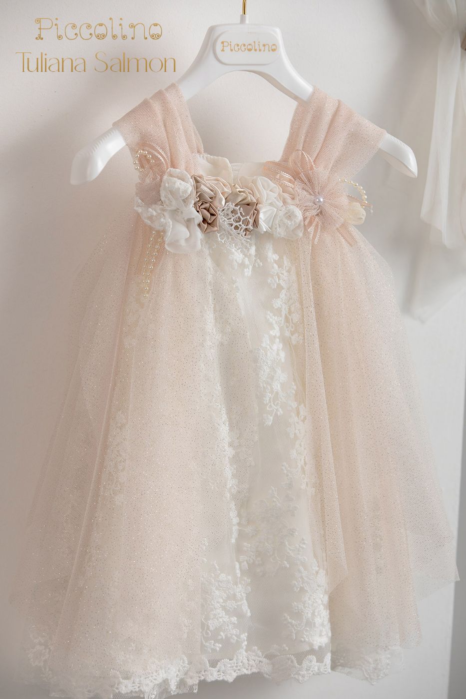 Βαπτιστικό φόρεμα σε ριχτή γραμμή απο δαντέλα, με κομμάτια απο απαλό σάπιο μήλο, τούλι με χρυσό γκλίτερ τα οποία αποτελούν τις τιράντες και την προέκταση τους εμπρός και πίσω. Το ντεκόρ του φορέματος αποτελείται απο 22 χειροποίητα λουλούδια, δαντέλες και κορδέλες. Το φόρεμα συνοδεύεται απο μπαντάνα με ντεκόρ όμοιο με το φόρεμα.