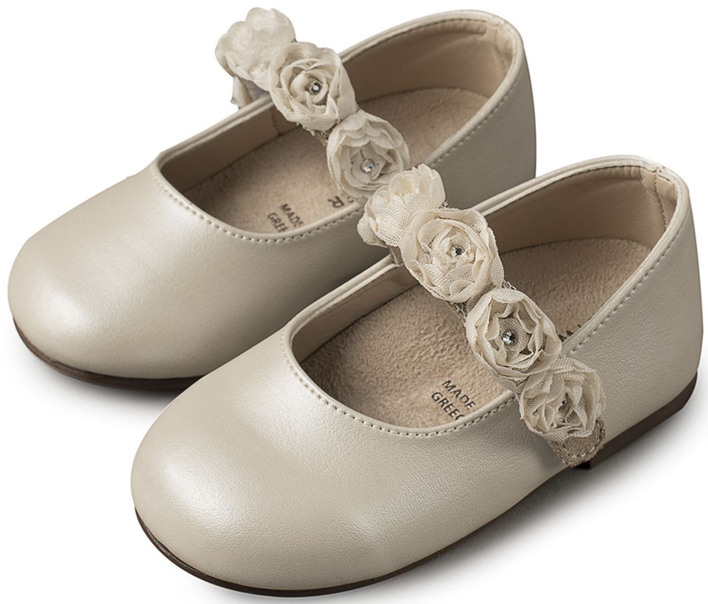 Δερμάτινο Γοβάκι Μονή Μπαρέτα με Chiffon Λουλούδια από Συνθετικό Δέρμα σε Εκρού χρώμα