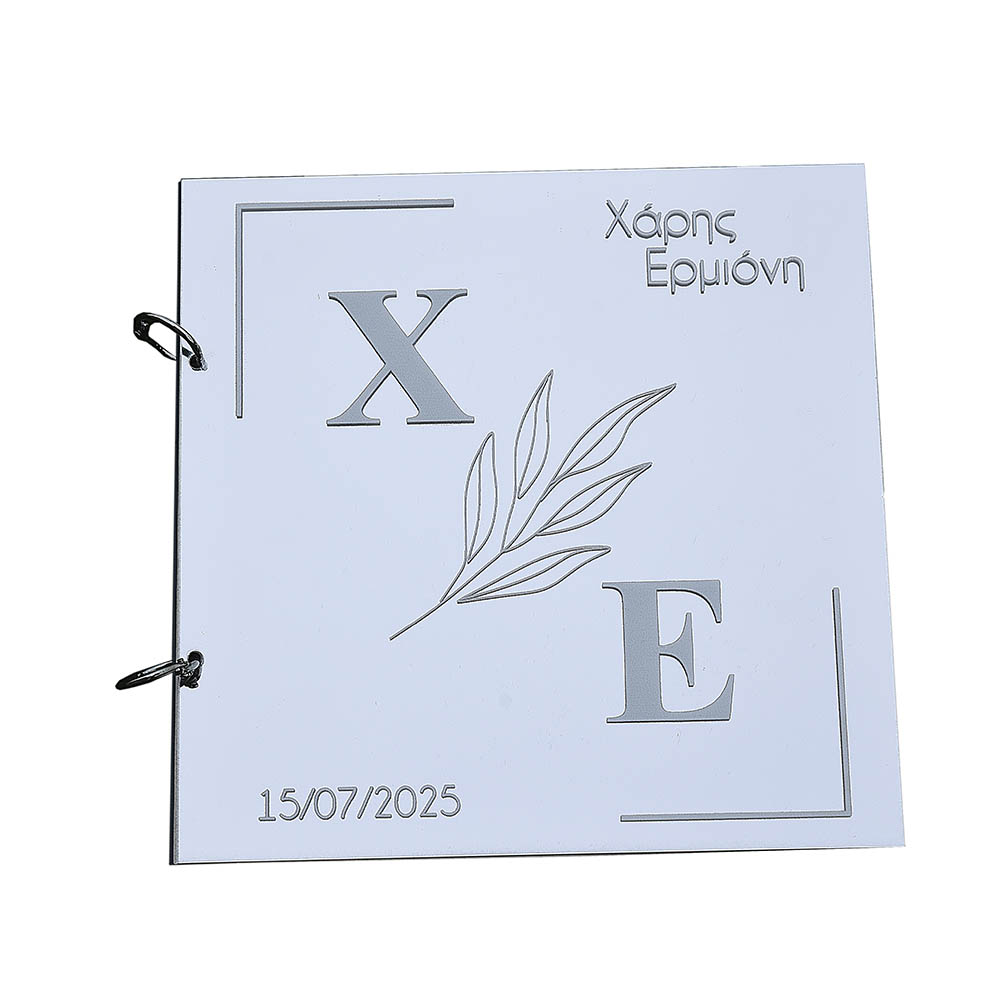 Χειροποίητο ξύλινο βιβλίο ευχών με μίνιμαλ σχεδιασμό σε λευκή απόχρωση ξύλου, διακοσμημένο με ένα διακριτικό κλαδί ελιάς-σύμβολο ειρήνης και ευημερίας. Η βιβλιοδεσία με μεταλλικούς κρίκους εξασφαλίζει ανθεκτικότητα και επιτρέπει το εύκολο ξεφύλλισμα, καθιστώντας το ένα ιδανικό ενθύμιο που θα κοσμεί τη βιβλιοθήκη σας για χρόνια