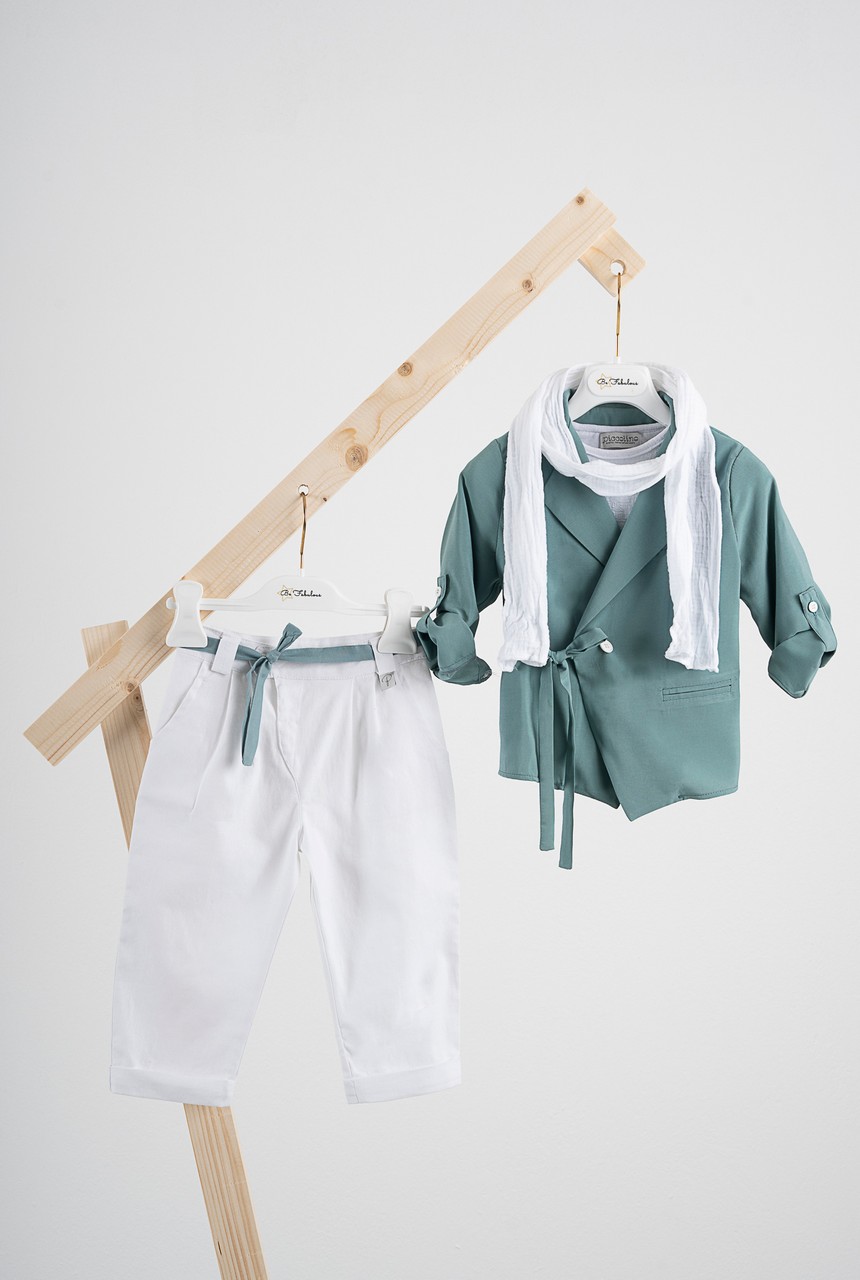 Κοστούμι Piccolino Stefan σε χρώμα Mint. Περιλαμβάνει βισκόζη πουκαμίσα με δέσιμο με ζωνάκι, βαμβακερό λευκό μπλουζάκι, παντελόνι λινό βράκα με πιέτες λευκό, ζωνάκι και φουλάρι. Διαθέσιμο σε 4 μεγέθη 6-12, 12-18, 18-24, 24-36 (εξτρά χρέωση)