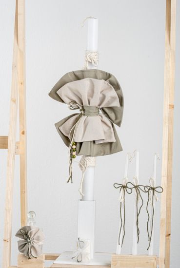 Βαπτιστικό πακέτο Piccolino Gustavo sage περιλαμβάνει κοστούμι ,σετ λαδόπανα, λαμπάδα, λαδοσετ και στολισμένη τσάντα καφέ