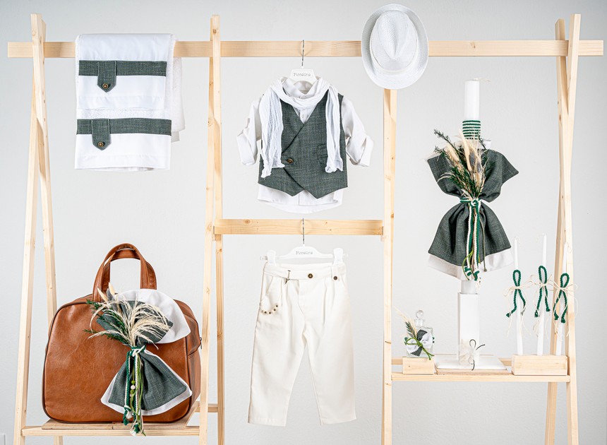 Βαπτιστικό πακέτο Piccolino Jose white περιλαμβάνει κοστούμι ,σετ λαδόπανα, λαμπάδα, λαδοσετ και στολισμένη τσάντα καφέ