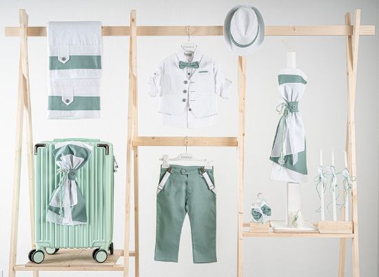 Βαπτιστικό πακέτο Piccolino Lorenzo mint περιλαμβάνει κοστούμι ,σετ λαδόπανα, λαμπάδα, λαδοσετ και στολισμένη βαλίτσα mint