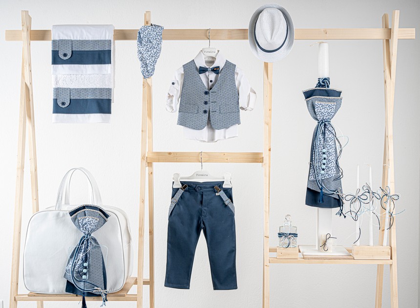 Βαπτιστικό πακέτο Piccolino Pablo cobalt περιλαμβάνει κοστούμι ,σετ λαδόπανα, λαμπάδα, λαδοσετ και στολισμένη τσάντα λευκή