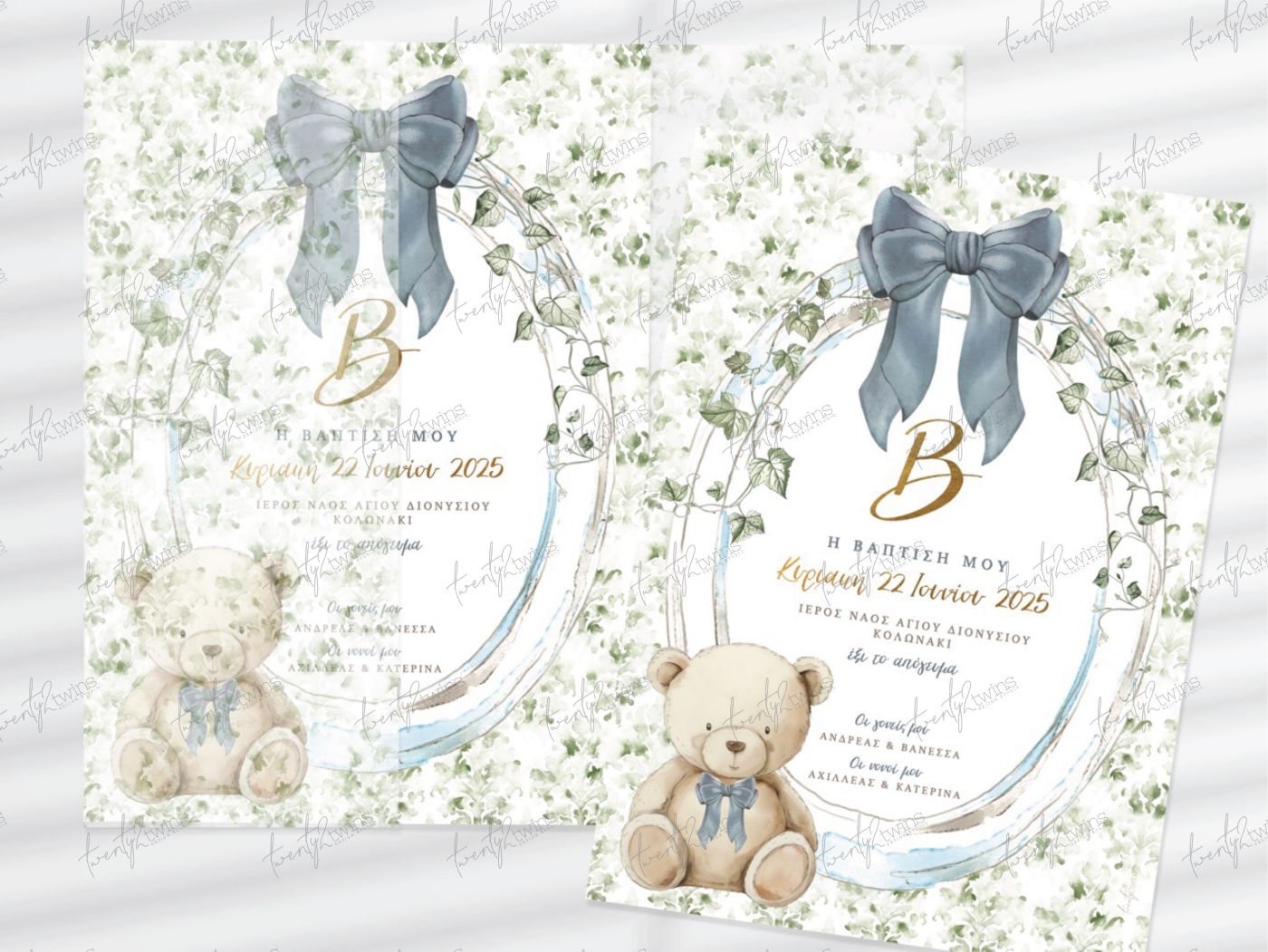 Πρωτότυπο προσκλητήριο βάπτισης 22twins με αρκουδάκι και γαλάζιο φιόγκο. Το ιδανικό κλασικό θέμα για τη βάπτιση του γιου σας.