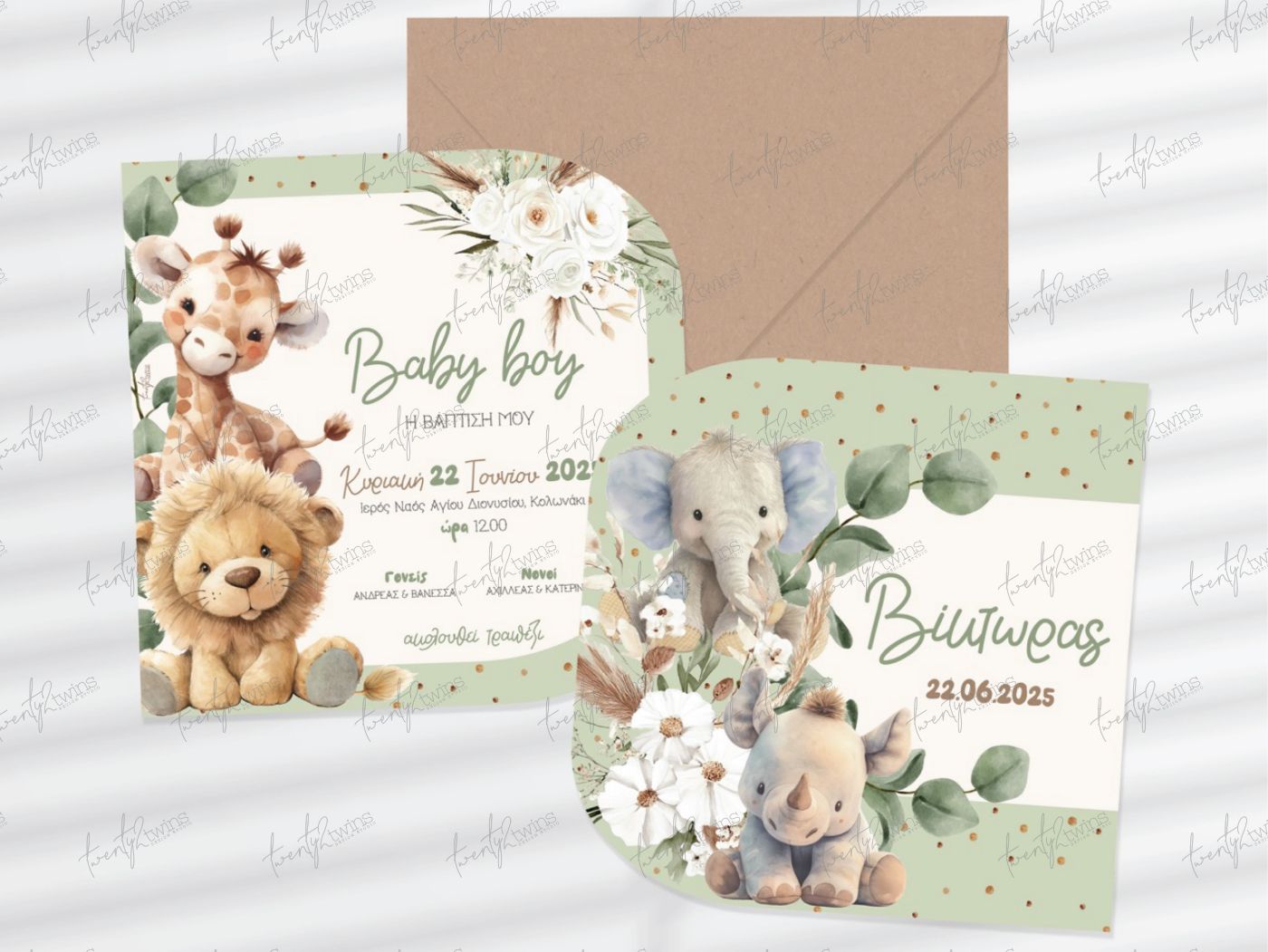 Προσκλητήριο βάπτισης για αγόρι από την 22twins με θέμα τα ζωάκια του Σαφάρι. Λιοντάρι, καμηλοπάρδαλη και ελέφαντας σε ένα boho σχέδιο.
