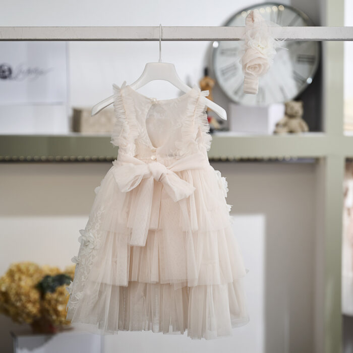 Το φόρεμα συνοδεύεται από ασορτί κορδέλα μαλλιών σε βανίλια τόνο, διακοσμημένη με τούλι και χειροποίητο λουλούδι, ολοκληρώνοντας αρμονικά την εμφάνιση