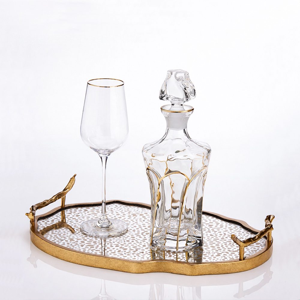 Σετ κουμπάρου με κρυστάλλινη καράφα και χρυσό δίσκο με ανάγλυφο καθρέπτη