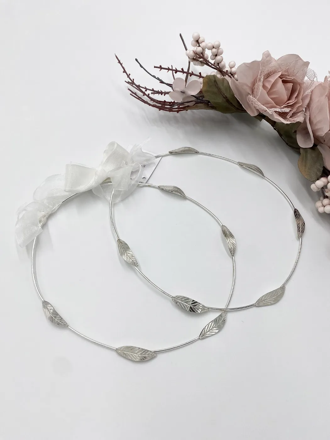 Χειροποίητα ασημένια στέφανα γάμου Day Dream Events με φύλλα ελιάς.