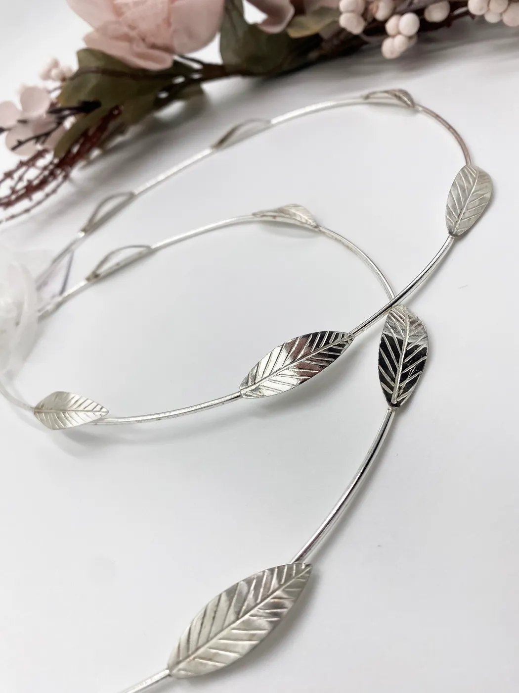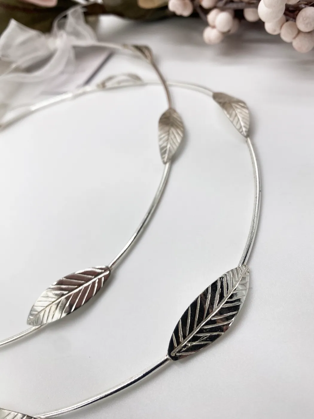 Χειροποίητα Στέφανα Γάμου με κομψό, μίνιμαλ σχεδιασμό που διαθέτουν διακριτικά μεταλλικά φύλλα ελιάς. Είναι από ασήμι 925. Το στυλ τους είναι μοντέρνο, ρομαντικό και εμπνευσμένο από τη φύση