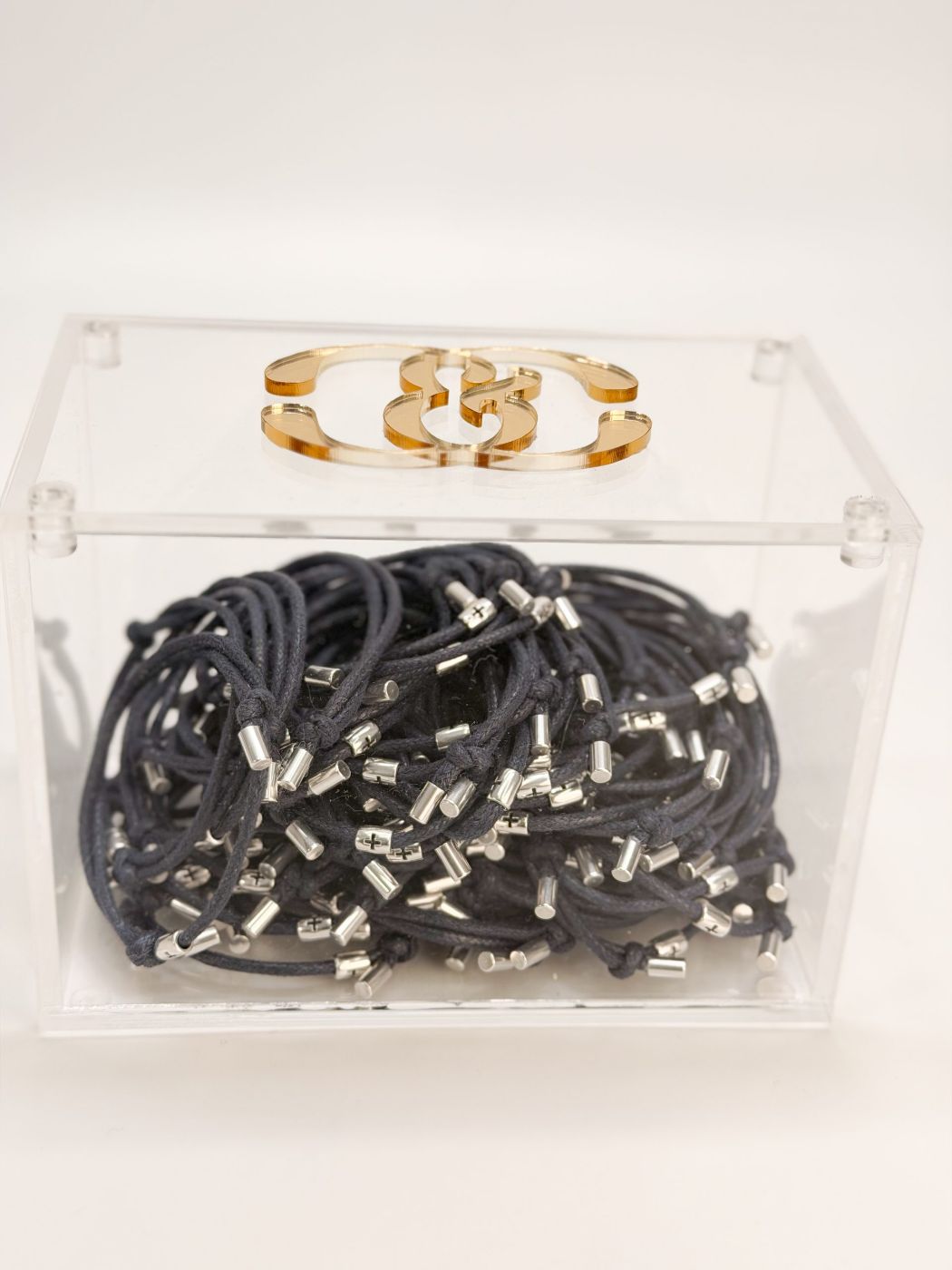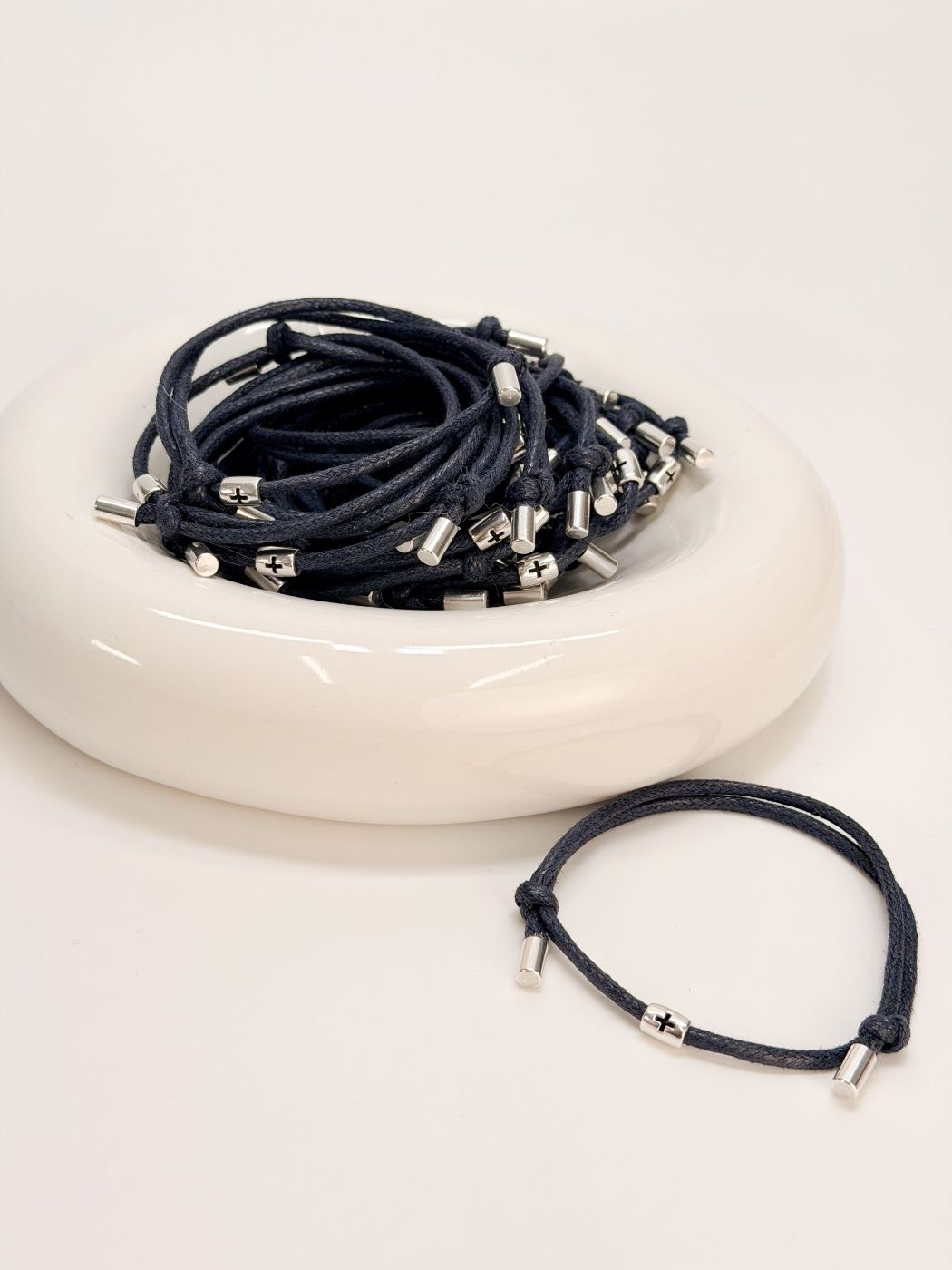 Μαρτυρικό βραχιόλι με μπλε κορδόνι, σταυρό και τάπες σε ασημί απόχρωση.