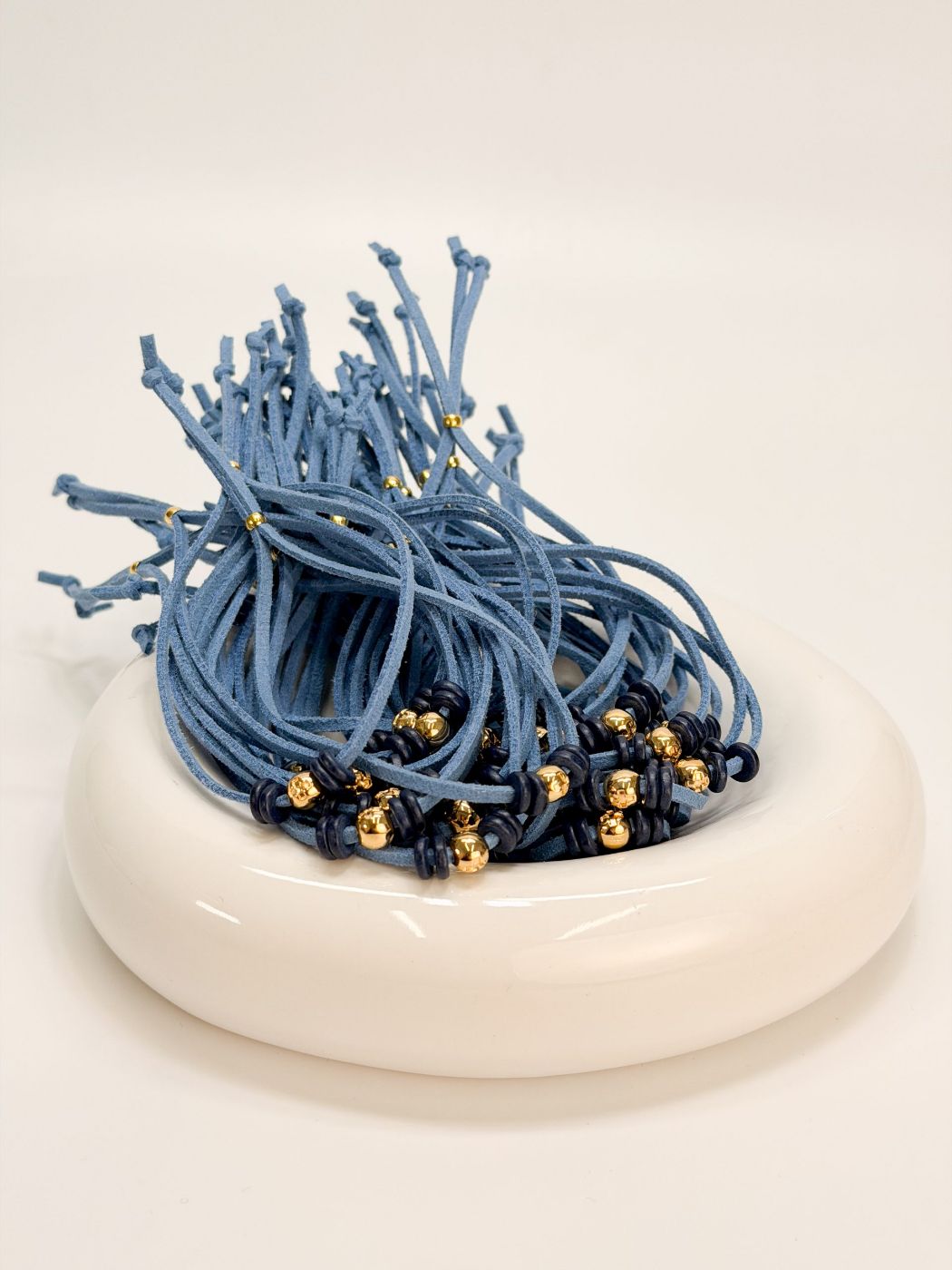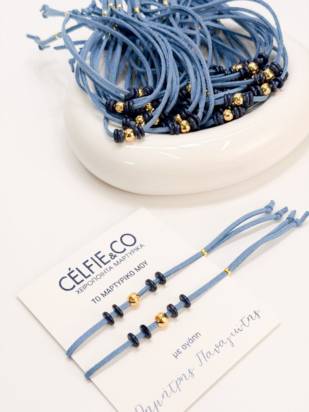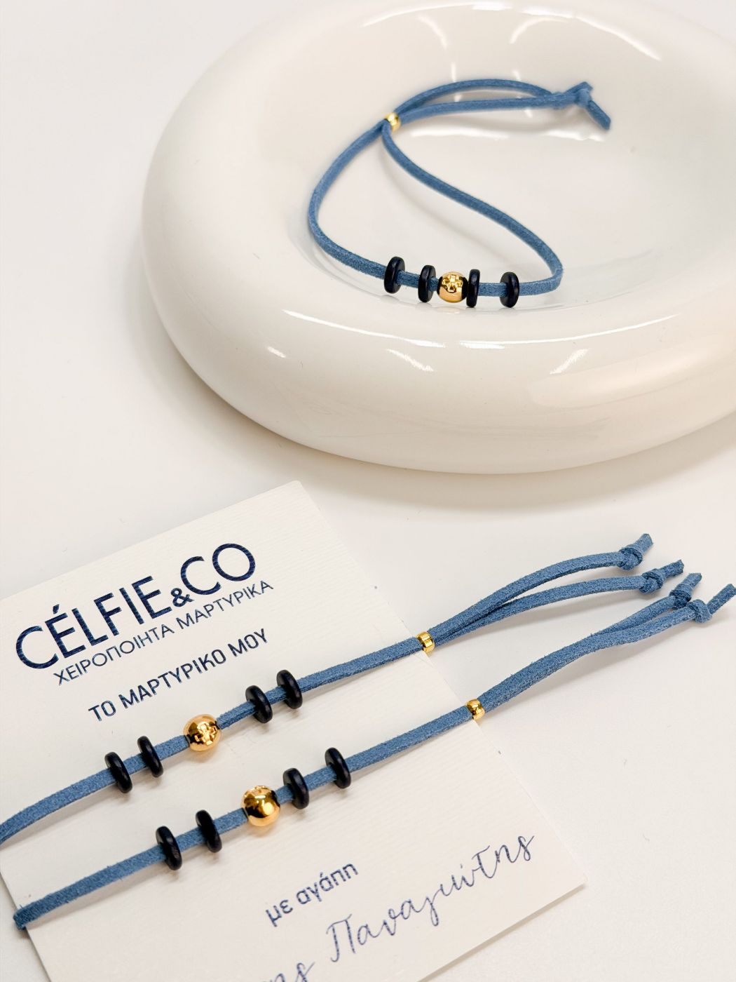 Μαρτυρικό βραχιόλι με μπλε ραφ σουετ κορδόνι, επιχρυσωμένο σταυρό και κεραμικές ροδέλες.