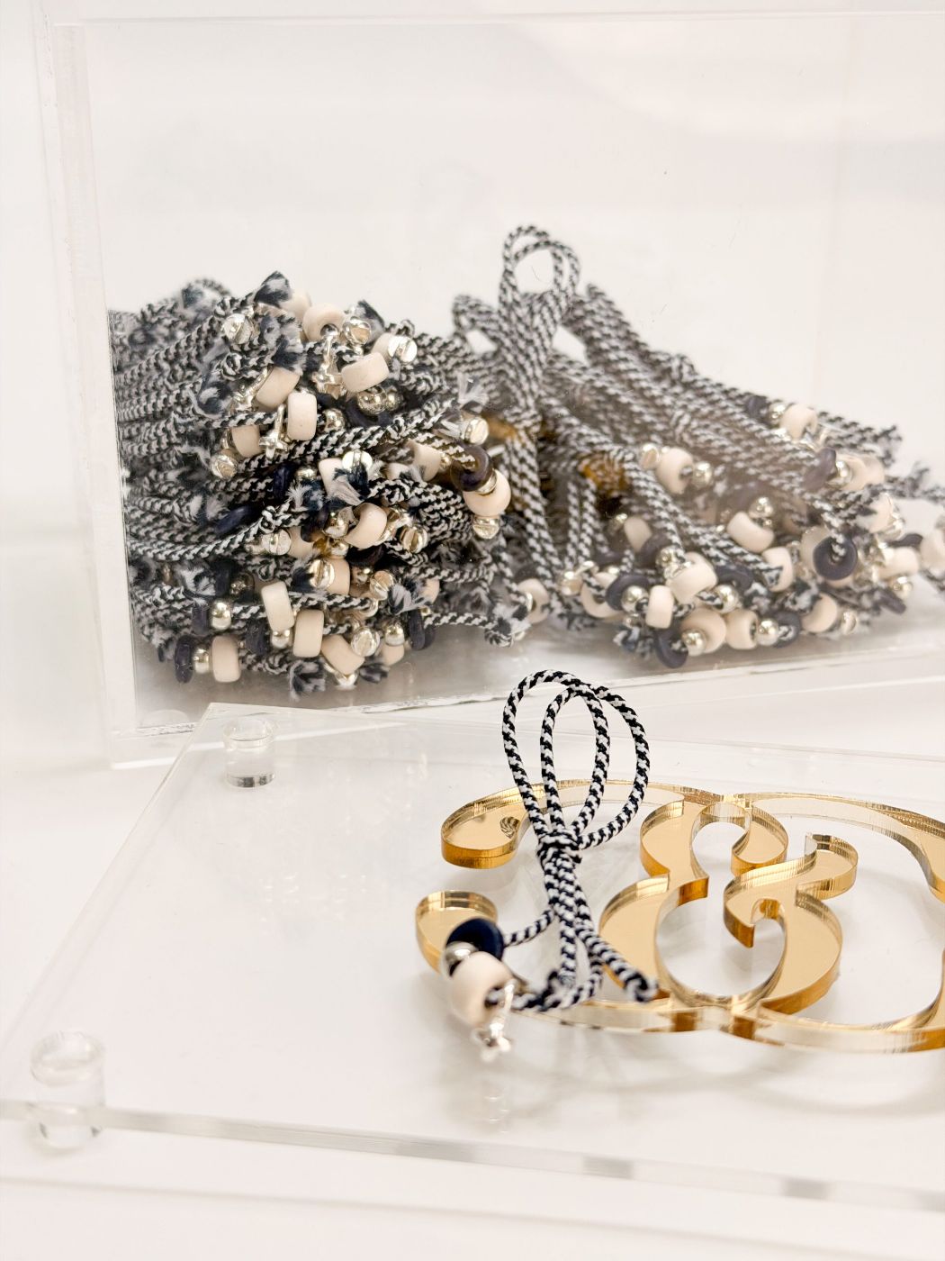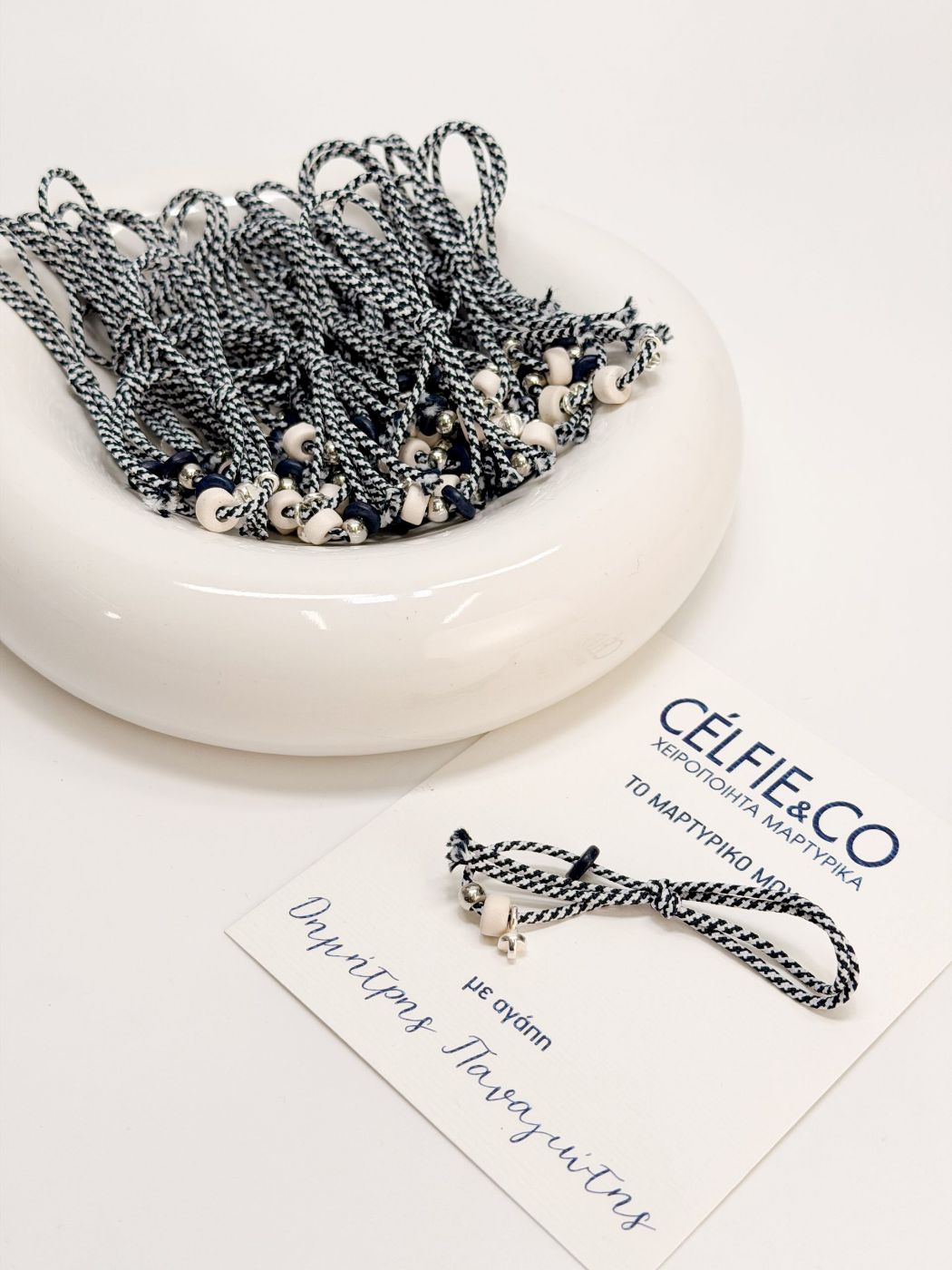 Μαρτυρικό πέτο με δίχρωμο κορδόνι μπλε σκούρο και άσπρο,κεραμικές χάντρες,σταυρό και χάντρα σε ασημί απόχρωση. Ένα μαρτυρικό δώρο που θα μείνει στους καλεσμένους σας.