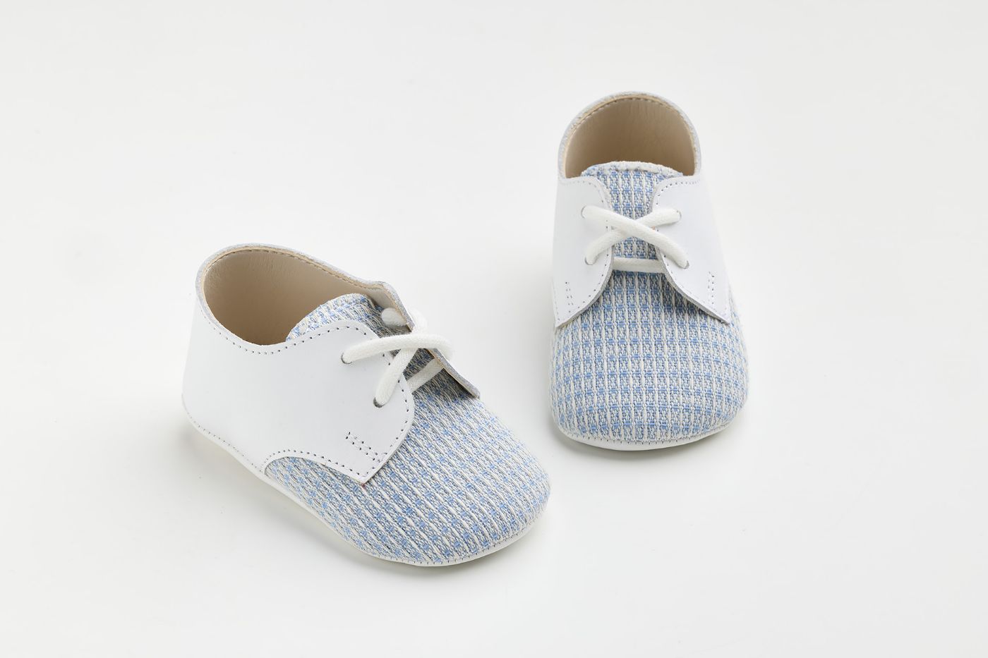 A602P - παπουτσάκι αγκαλιάς σε λευκό λείο δέρμα και ύφασμα με γαλάζιο μοτίβο
