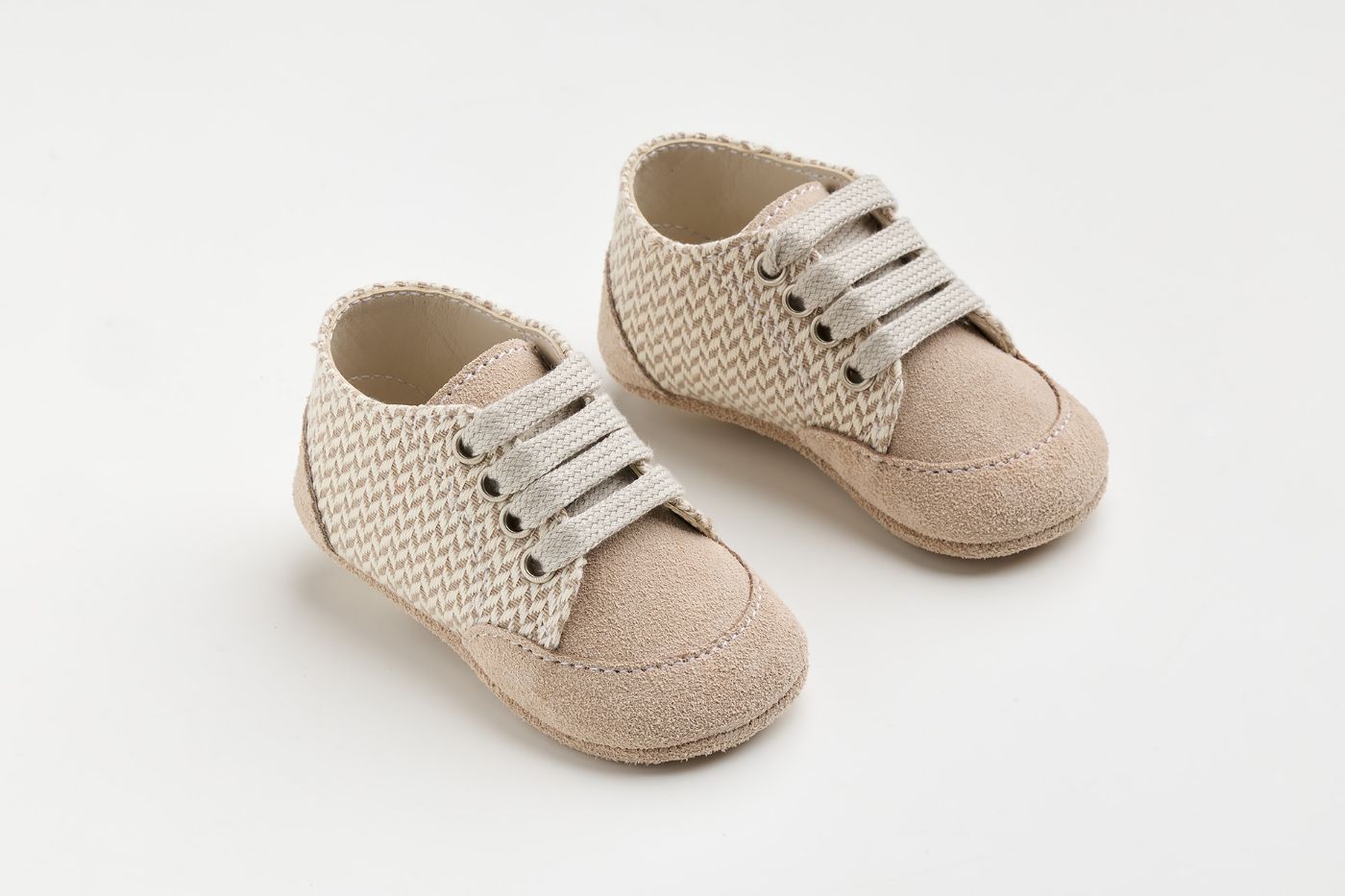 A605E - παπουτσάκι αγκαλιάς σε μπεζ καστόρ δέρμα και μπεζ ύφασμα με μοτίβο