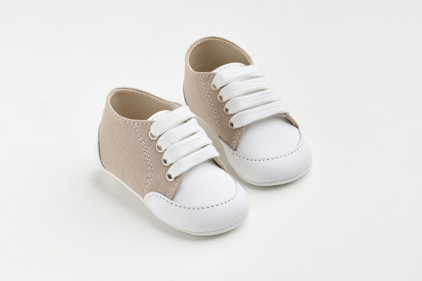 A606A - παπουτσάκι αγκαλιάς σε λευκό λείο δέρμα και μπεζ ύφασμα