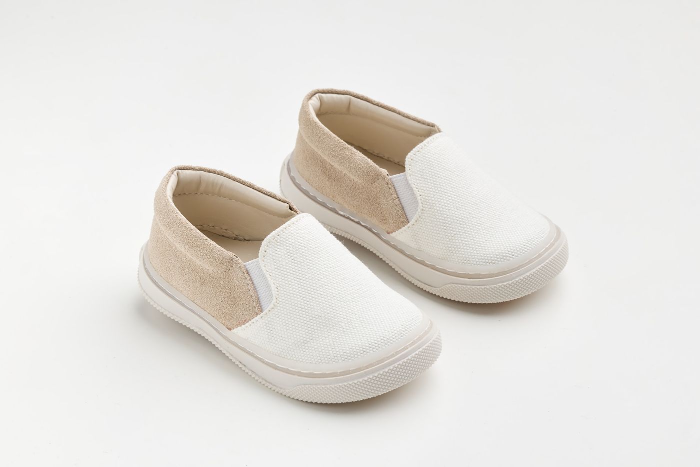 Εσπαντρίγια περπατήματος, σε λευκό ύφασμα και μπεζ καστόρ δέρμα