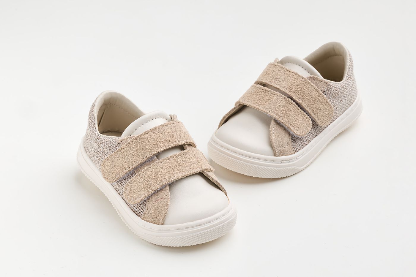 Παπουτσάκι περπατήματος σε μπεζ ύφασμα, μπεζ καστορ και λευκό δέρμα