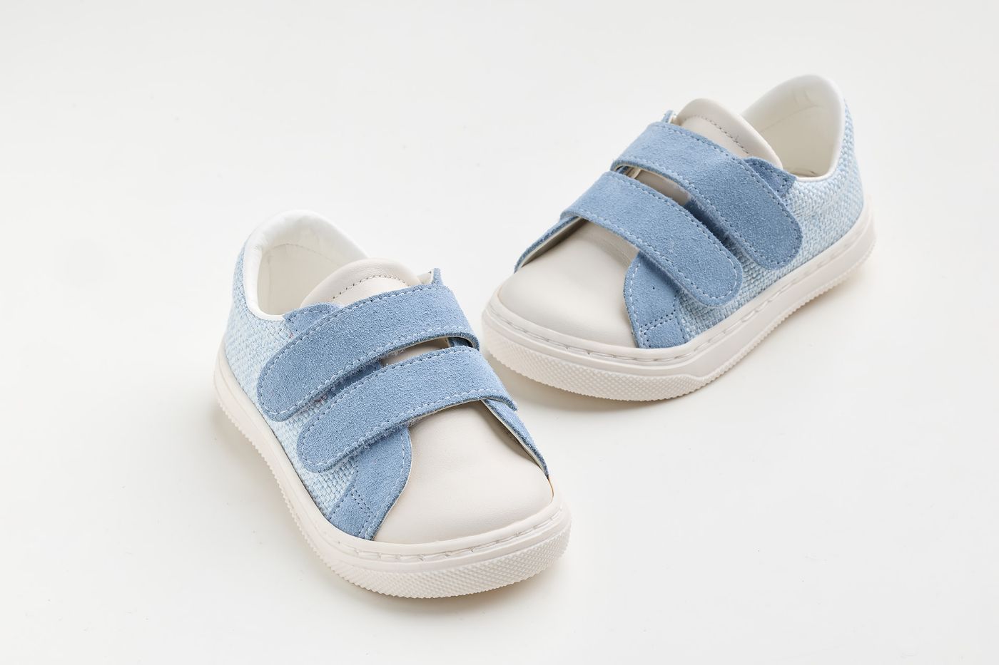 Παπουτσάκι περπατήματος σε λευκό δέρμα, γαλάζιο ύφασμα και γαλάζιο καστόρ δέρμα